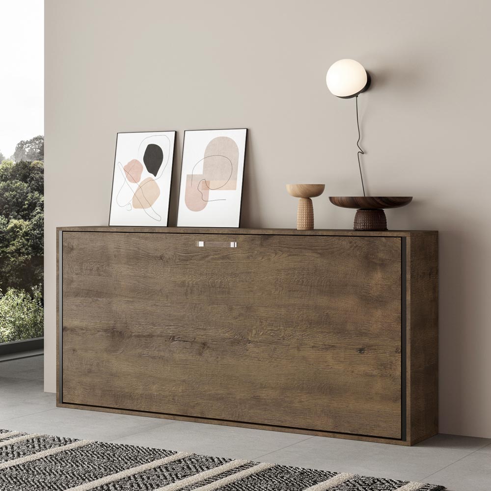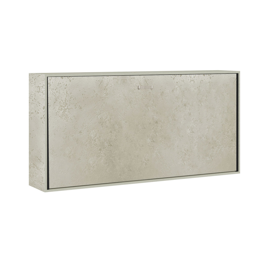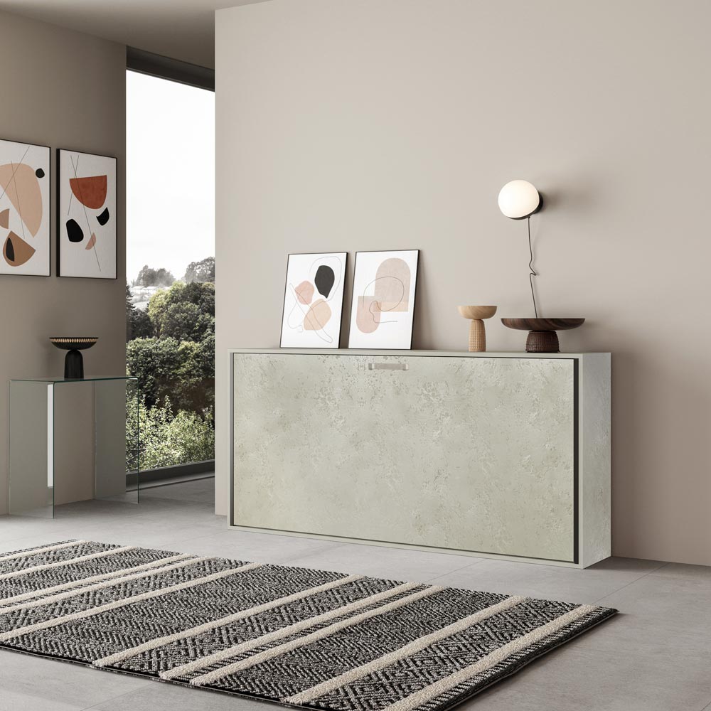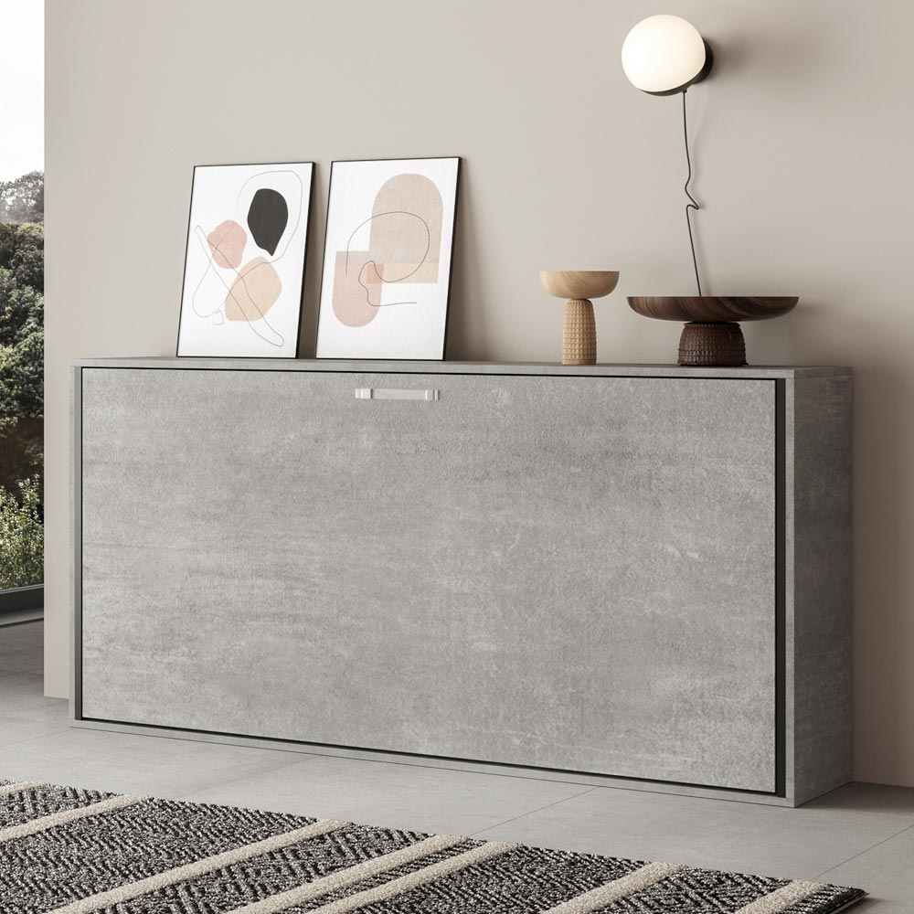 Cama horizontal dobrável realizada com estrutura em painéis de partículas de madeira enobrecidas de 18 mm de espessura, base da cama em ferro reforçado com pintura a pó epóxi na cor alumínio gofrado.