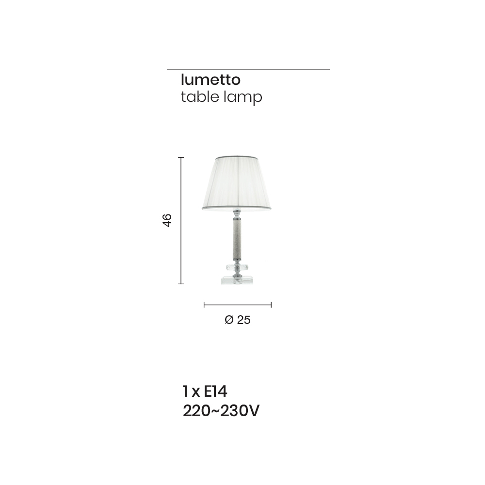 O design termina com um abajur em tecido com efeito plissado que garante uma iluminação suave e difusa; perfeito tanto para mesas de cabeceira de quarto como para secretária de escritório ou sala de estilo clássico e elegante.