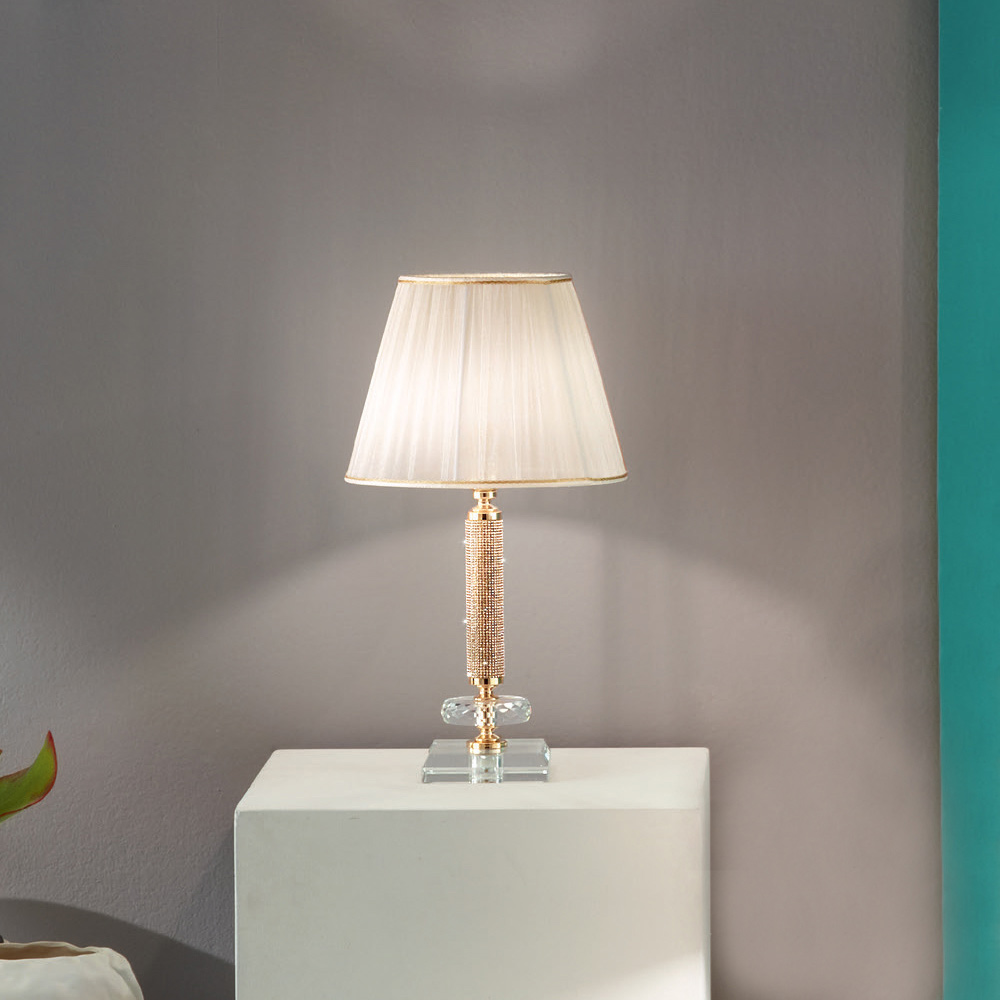 Este candeeiro de mesa é feito com uma base quadrada em cristal lapidado transparente e uma estrutura metálica dourada embelezada com purpurina colocada na superfície e um disco circular feito de cristal lapidado.