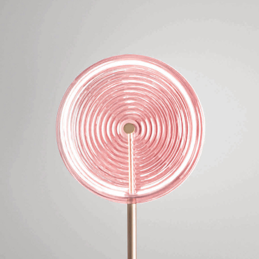 metal pintado com acabamento dourado, vidro decorado com linhas concêntricas rosa com luz
