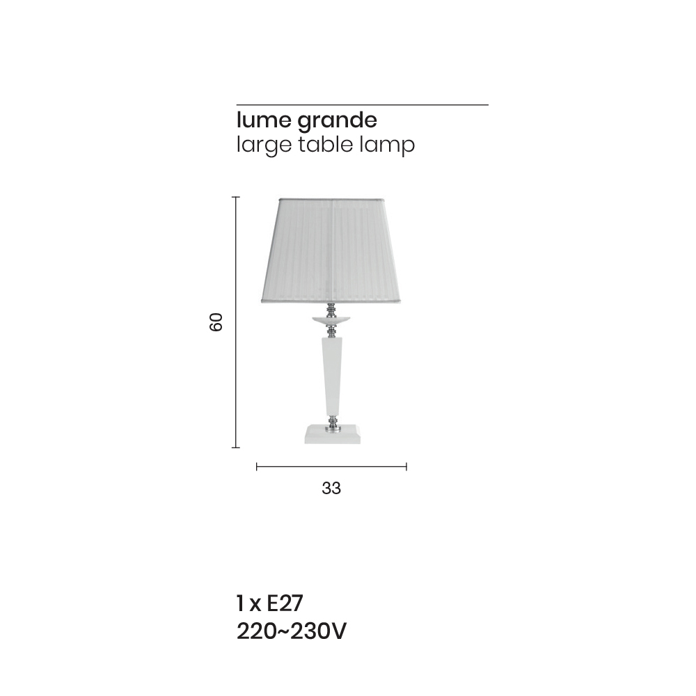 Capaz de caracterizar o ambiente, este candeeiro de mesa é composto por uma base quadrada branca , dois elementos quadrados em vidro branco trabalhado à mão e um abajur de tecido branco com efeito plissado.