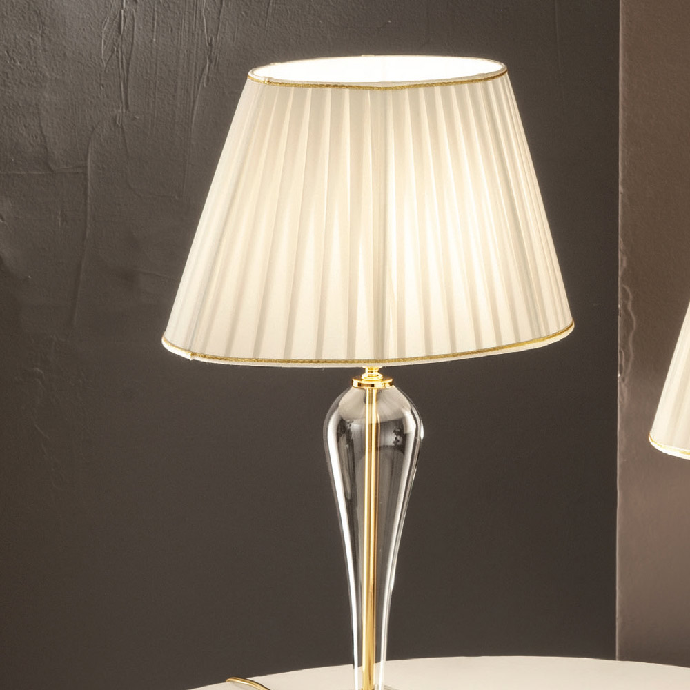 Feito com base de cristal transparente e elemento de formato cilíndrico em vidro transparente feito à mão, os pequenos detalhes e a tampa do porta-lâmpada são feitos de metal dourado ; o abajur, porém, é em tecido plissado com acabamento dourado.