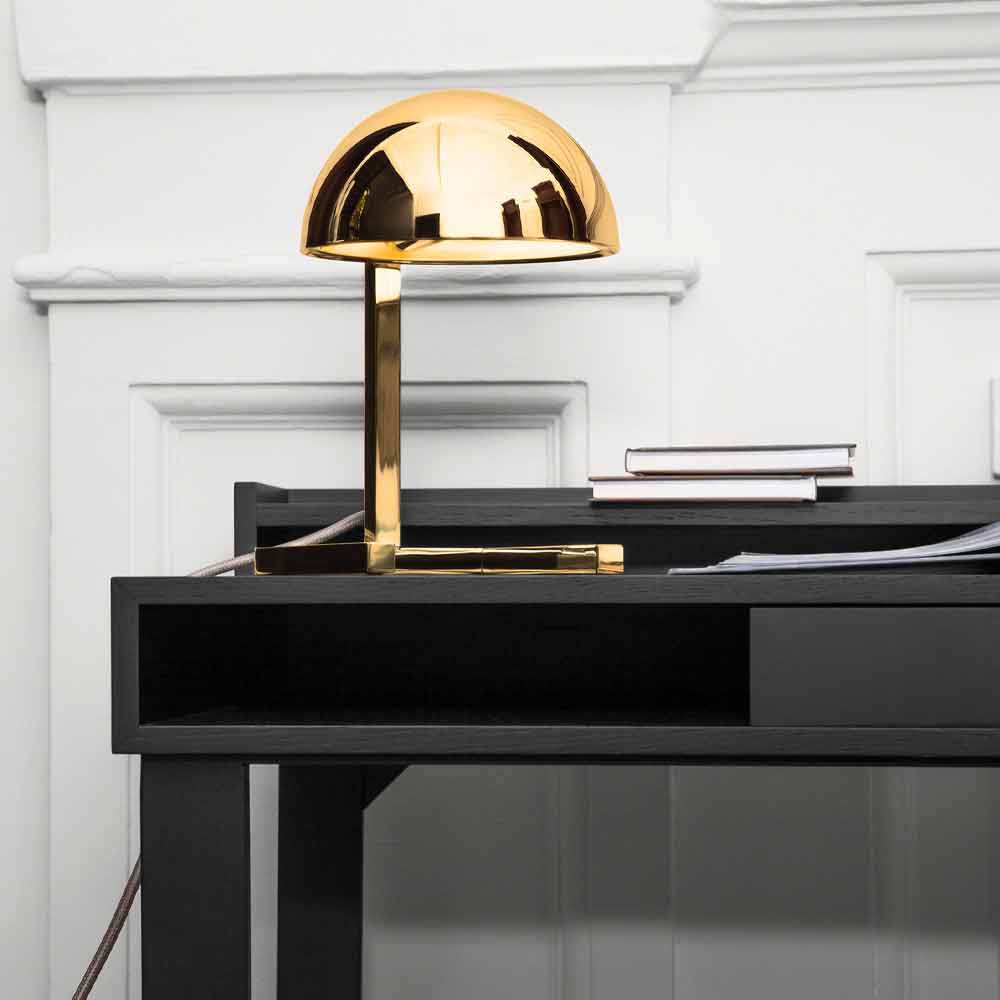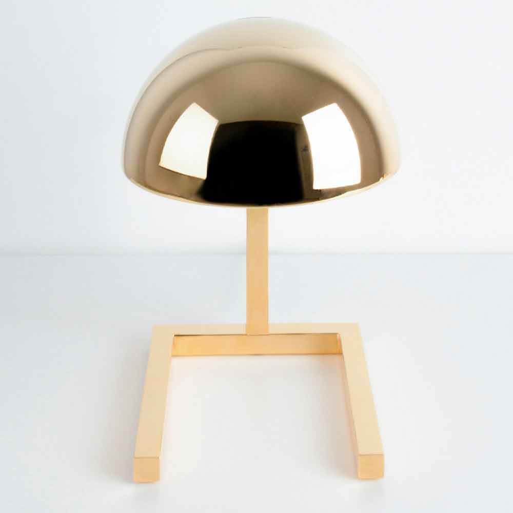 Candeeiro de mesa inteiramente feito na Itália em latão polido com cabo transparente de 140 cm equipado com botão ON-OFF . Seu design apresenta a utilização de diferentes formas geométricas que criam um resultado harmonioso e maravilhoso com uma estética quase futurista. A sua estrutura é formada por uma tampa esférica que é colocada sobre um pedestal de figura quadrangular que dá vida a uma ideia de iluminação original e criativa, ideal tanto para ambientes domésticos como para estudos ou escritórios onde contribuirá para enriquecer o mobiliário graças a um design extremamente toque elegante e refinado .