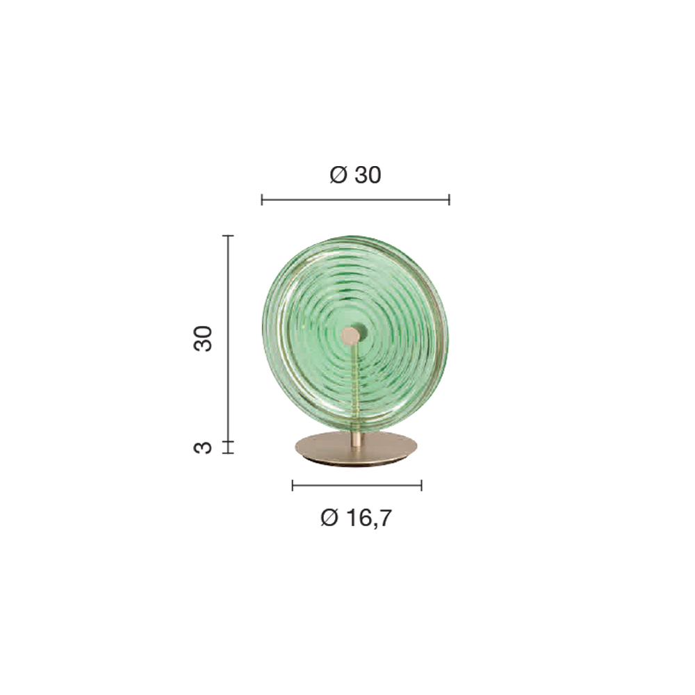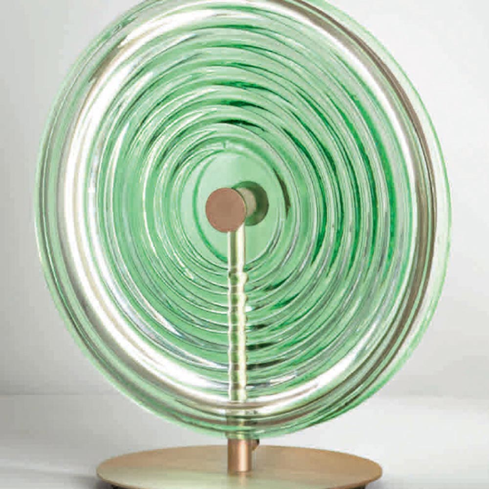metal pintado com acabamento dourado, vidro decorado com linhas concêntricas verdes com luz