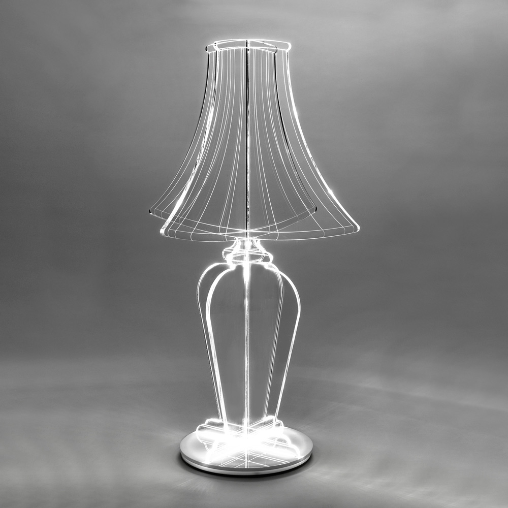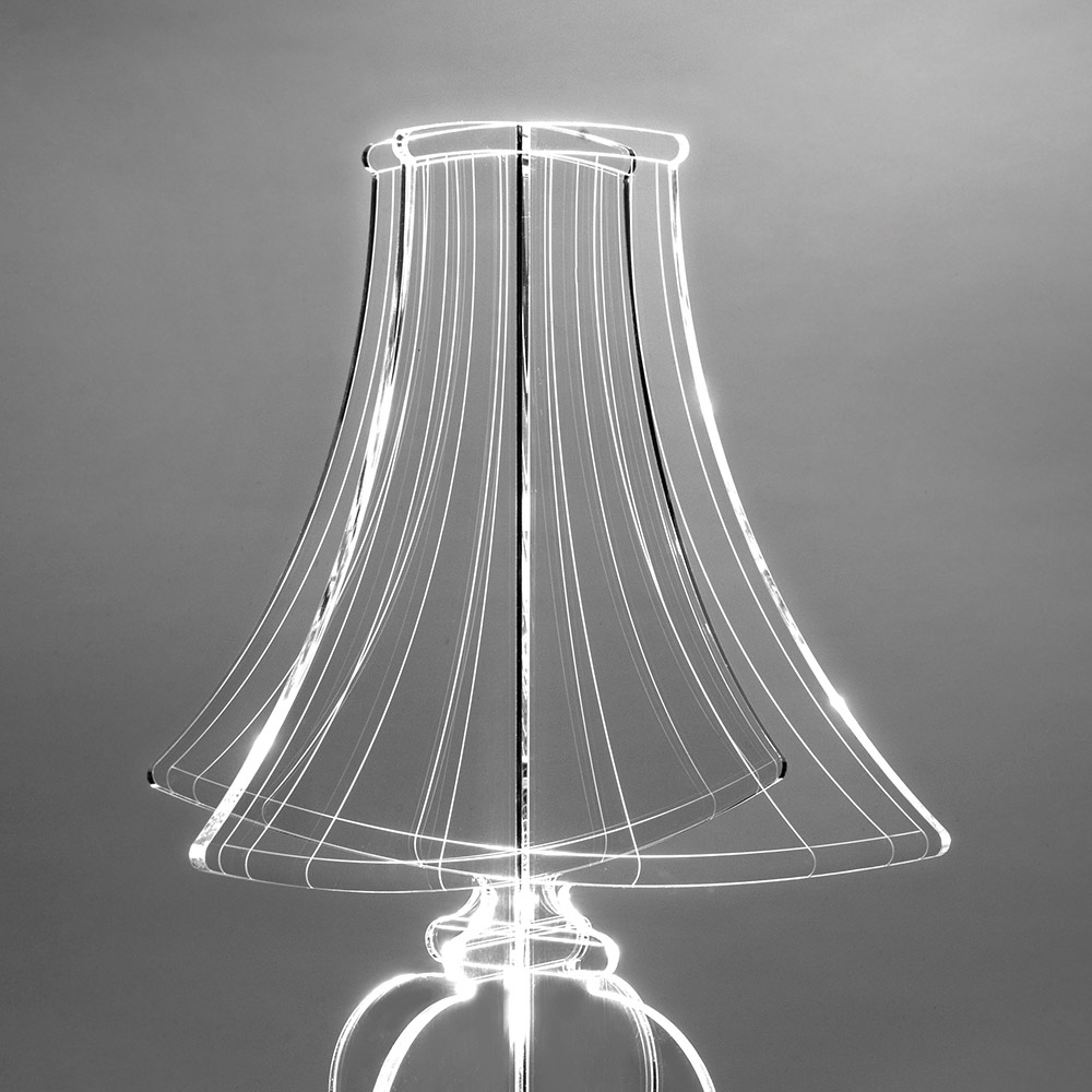 Deixe-se encantar por este candeeiro, uma verdadeira joia do design que alia inovação tecnológica à pura beleza estética . Esta lâmpada é uma escultura de luz. O plexiglass 100% PMMA, selecionado a partir de polímeros virgens, é meticulosamente trabalhado com a precisão do corte a laser, desenhando uma silhueta que se ilumina e ganha vida assim que a lâmpada acende.