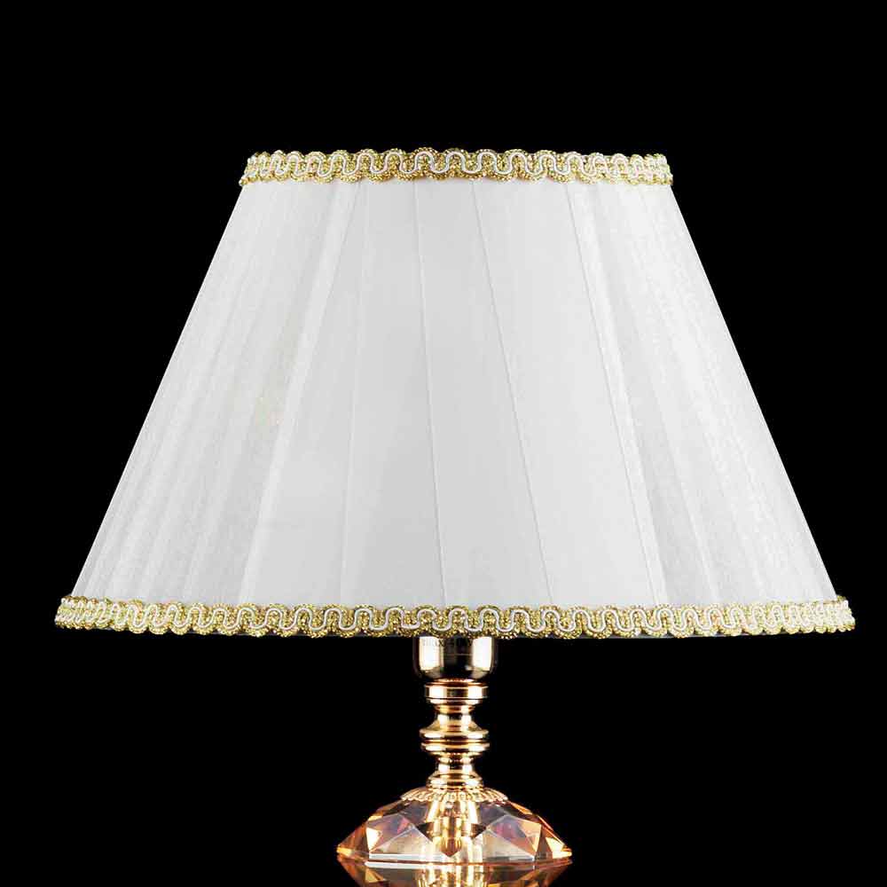 Candeeiro de design clássico em vidro âmbar e cristal, acabamento dourado. Abajur em organza e pongè.