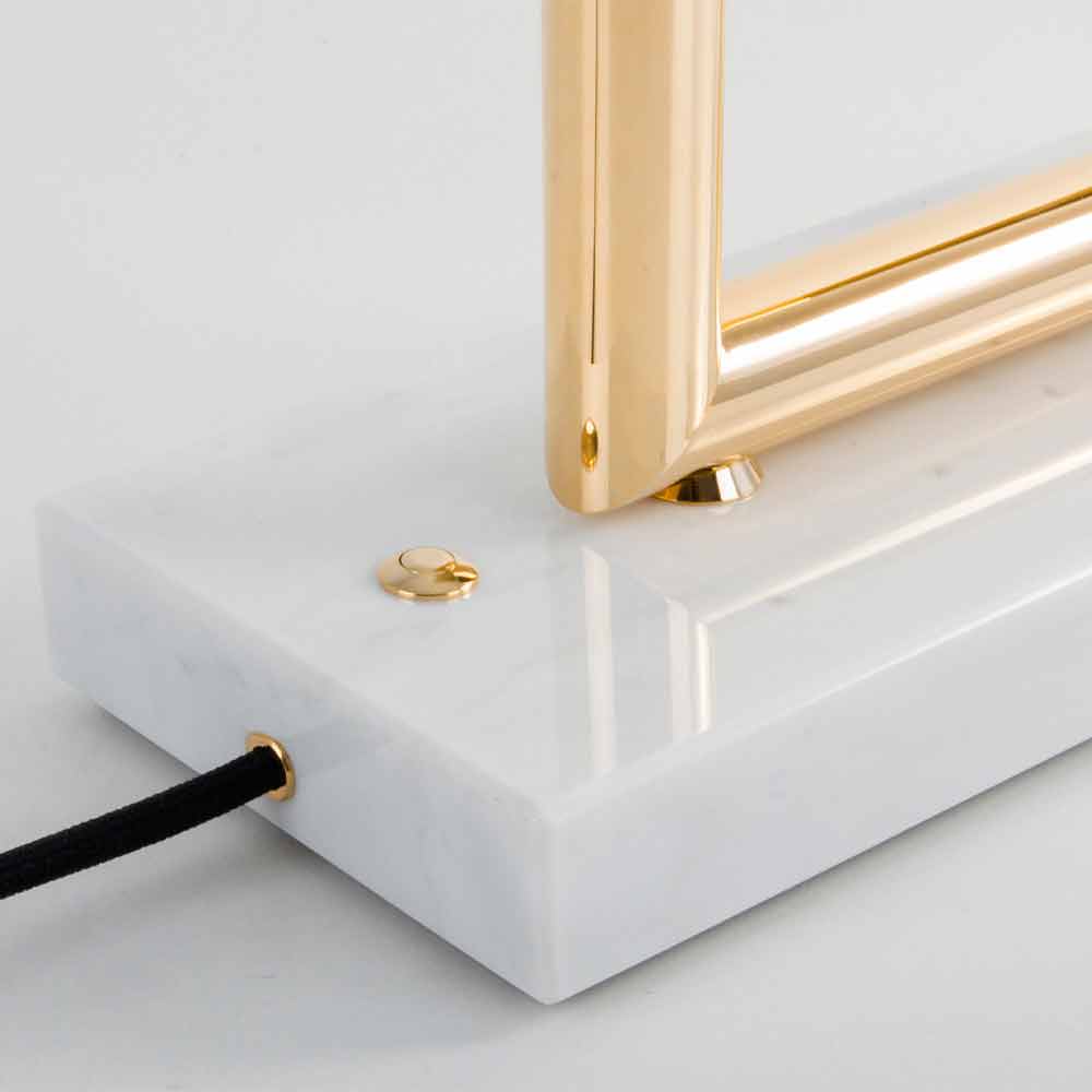 Candeeiro de mesa made in Italy com estrutura em latão polido , difusor em resina acrílica e base em mármore com cabo eléctrico em tecido preto, botão liga / desliga com regulador de intensidade de luz e fontes LED integradas.