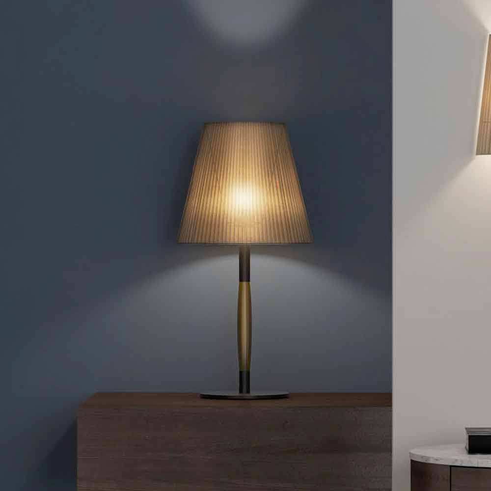 Candeeiro de mesa em metal e madeira com moderno abajur de organza Fabricado na Itália.