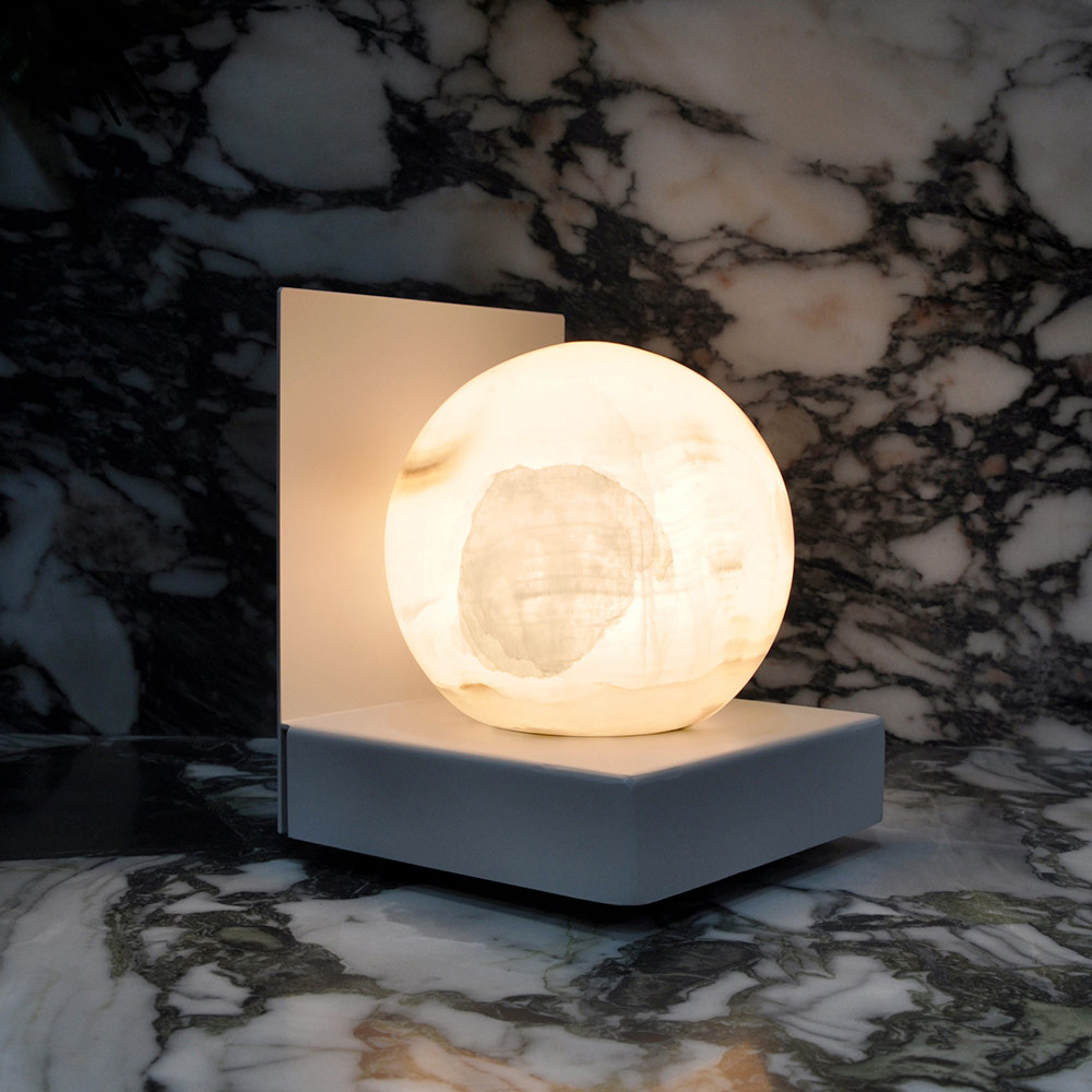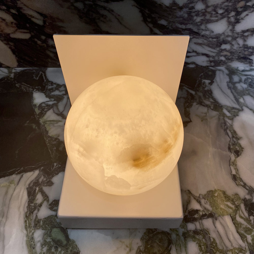 Este candeeiro esfera de mármore é uma afirmação de estilo e aconchego, perfeito para quem pretende adicionar um ambiente íntimo e acolhedor a qualquer ambiente. A forma esférica em mármore translúcido emana uma luz suave e difusa , projetando nas paredes os delicados padrões de seus veios naturais.