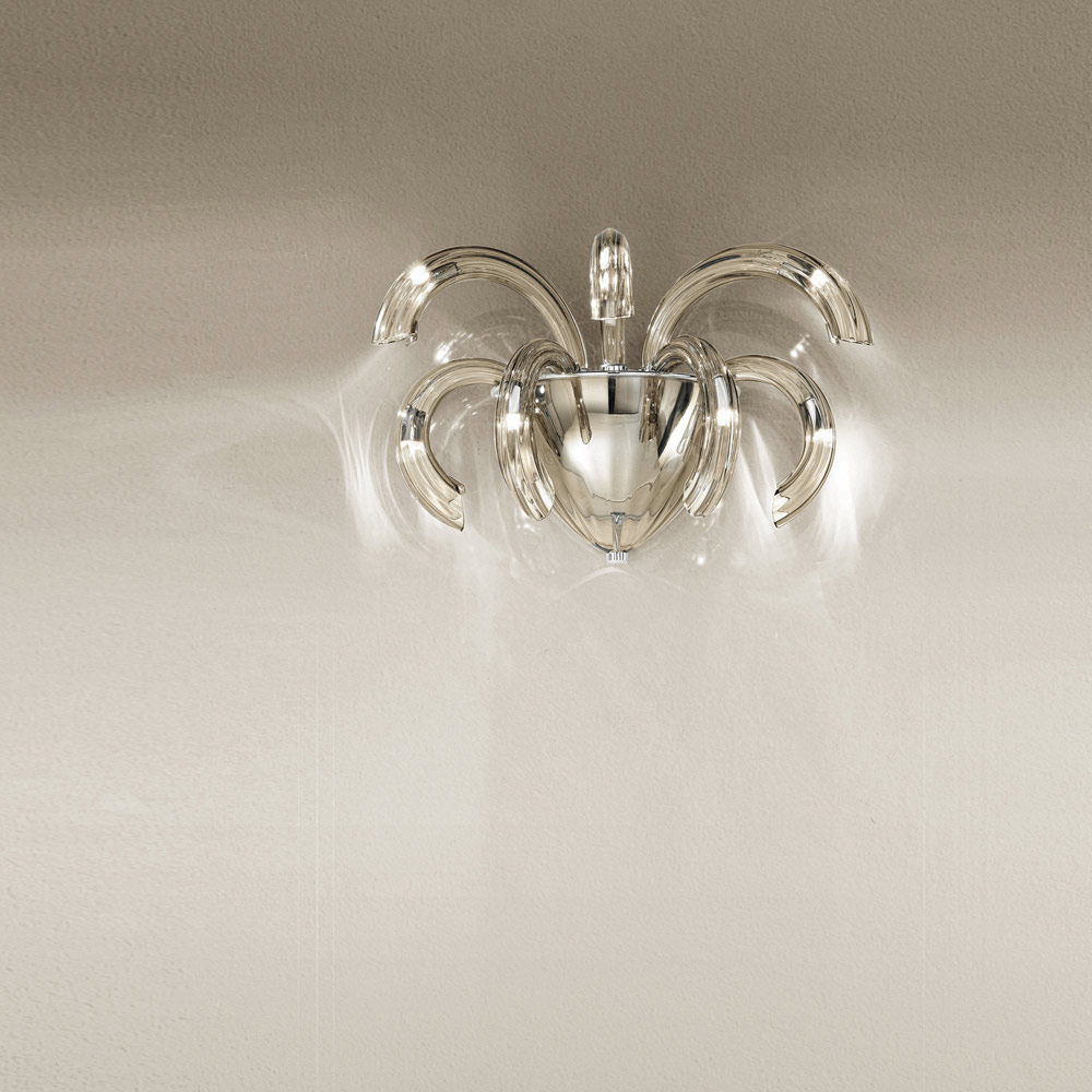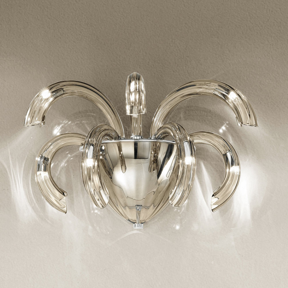 Luminária de parede artesanal na Itália em vidro Veneza, acabamento fumê com detalhes em metal cromado . Uma estética envolvente que se adapta a qualquer tipo de ambiente em que se encaixe com exuberância graças às suas formas e à funcionalidade do seu design. Os maravilhosos e elegantes braços curvos se expandem para fora para trazer luz em várias direções e iluminar a sala através de um efeito cenográfico original que lembra a explosão de fogos de artifício para um resultado criativo , refinado e de forte impacto visual .