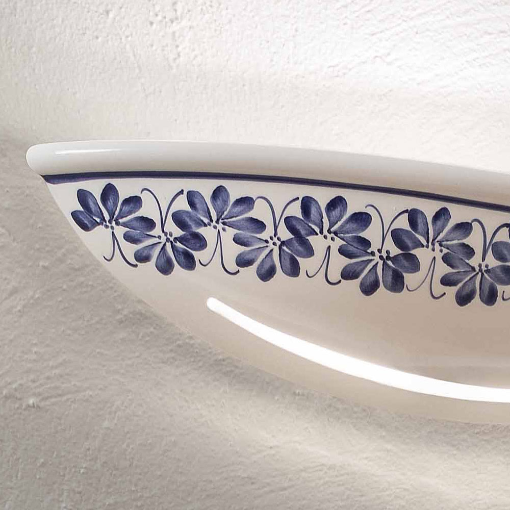 Este aplique em forma de meia-lua é inteiramente feito de cerâmica com motivos decorativos em fio azul pintados à mão , para destacar a habilidade e as habilidades manuais dos artesãos.