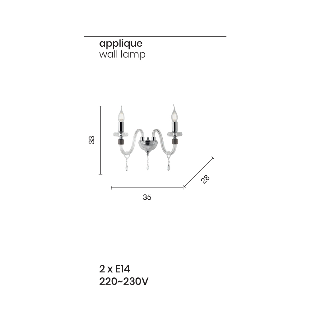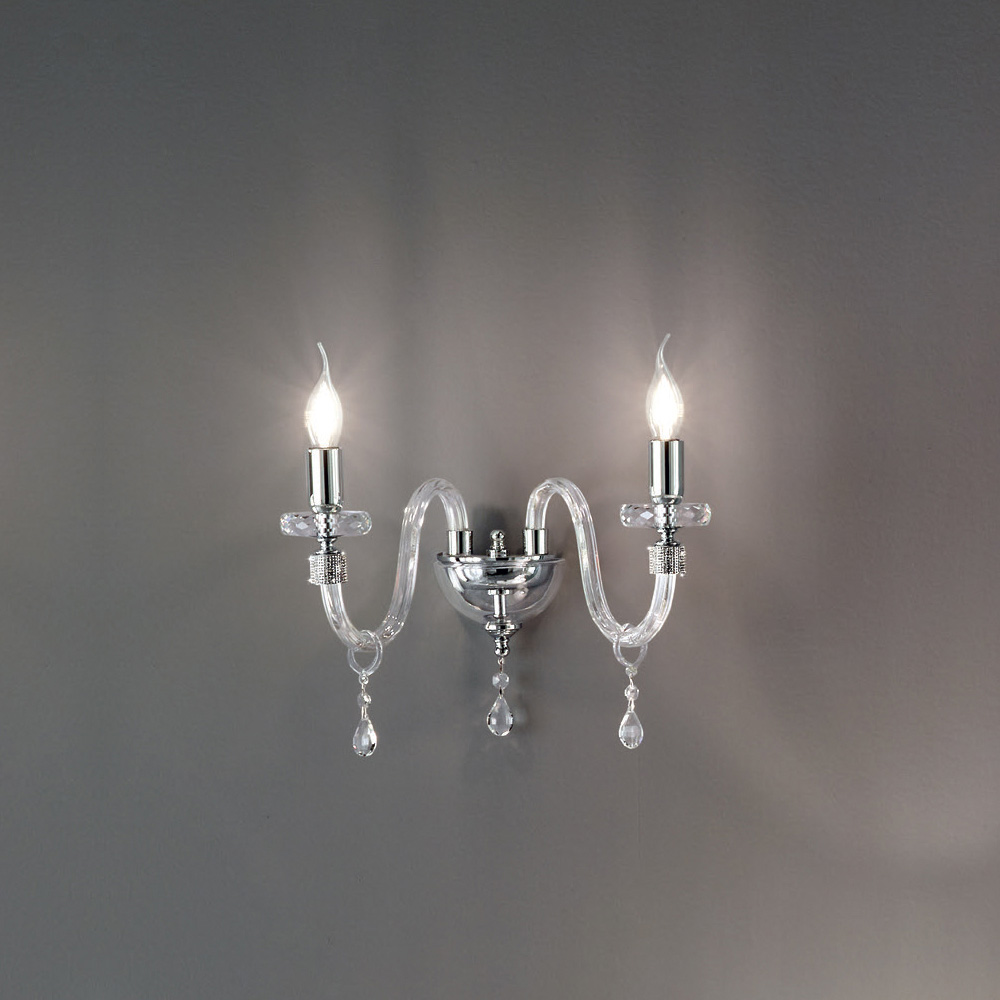 Este aplique de estilo clássico é composto por 2 braços arqueados feitos de vidro transparente feitos à mão na Itália com efeito "rigaton", cujas extremidades são cercadas por glitter fixado no metal, bem como pela parte central do complemento, onde dois tubos circulares suportam a estrutura intercalados com dois discos circulares de diferentes tamanhos feitos de cristal lapidado.