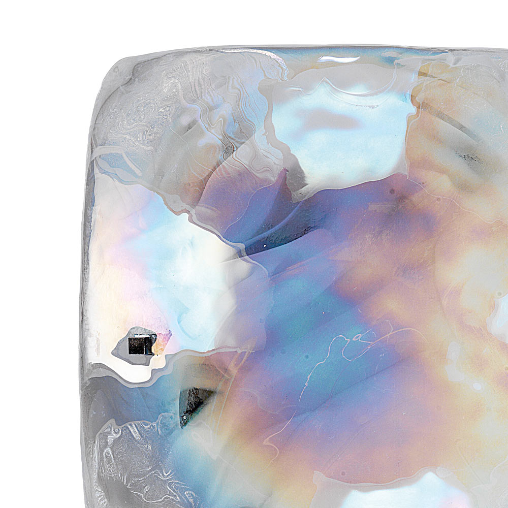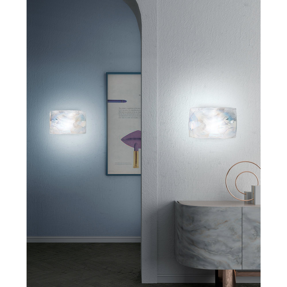 vidro laminado branco raiado com decoração de íris (efeito madrepérola) que dá ao ambiente um toque de elegância requintada graças à textura particular e ao efeito visual inédito criado pelo vidro para um efeito único resultado com grande personalidade.