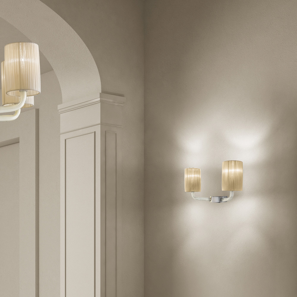 Luminária de parede em vidro Venice com acabamento branco-marfim feito à mão com detalhes em metal com acabamento cromado brilhante e elegantes abajures em tecido . Uma peça de mobiliário caracterizada por um design articulado, mas essencial , capaz de enriquecer o ambiente dando caráter graças à sua forte presença de palco típica dos lustres clássicos do passado. Os braços tubulares de vidro suportam de forma delicada e elegante os maravilhosos abajures de tecido que ajudam a transportar a luz em todas as direções para uma iluminação quente , suave e envolvente .