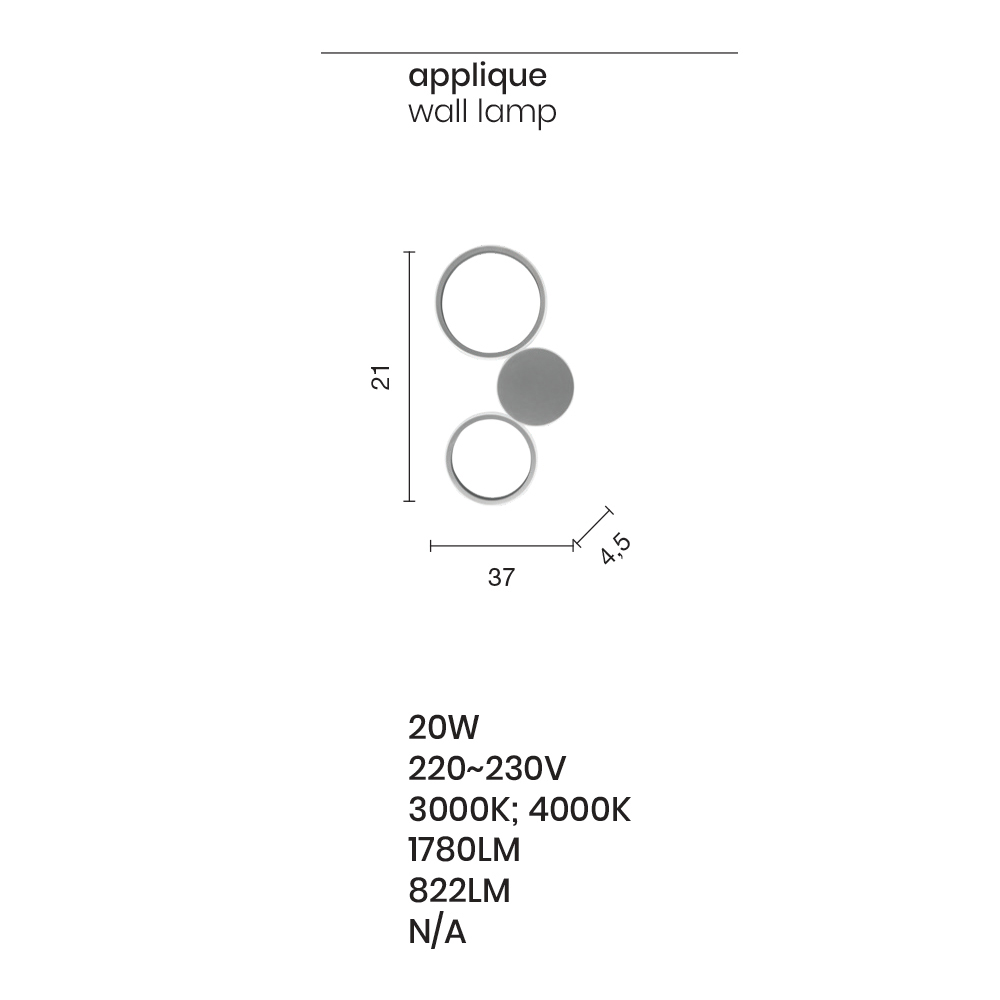 fonte de LED regulável. Elegância e originalidade se unem em uma composição moderna composta por três círculos de diferentes tamanhos unidos e cobertos externamente por um difusor branco leitoso que envolve a faixa de LED, criando belos efeitos de luz nas paredes para um resultado com