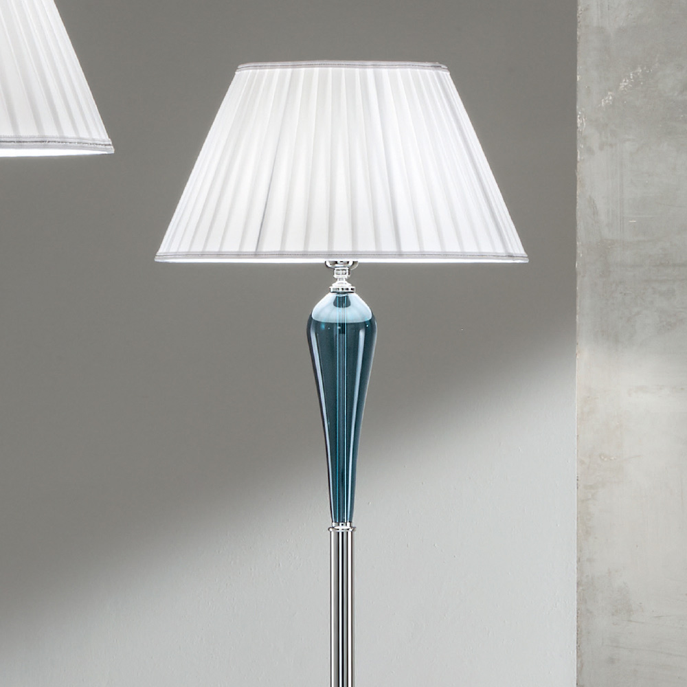 Este candeeiro de pé é composto por uma base redonda em metal cromado embelezada com motivos de vidro transparente colorido.