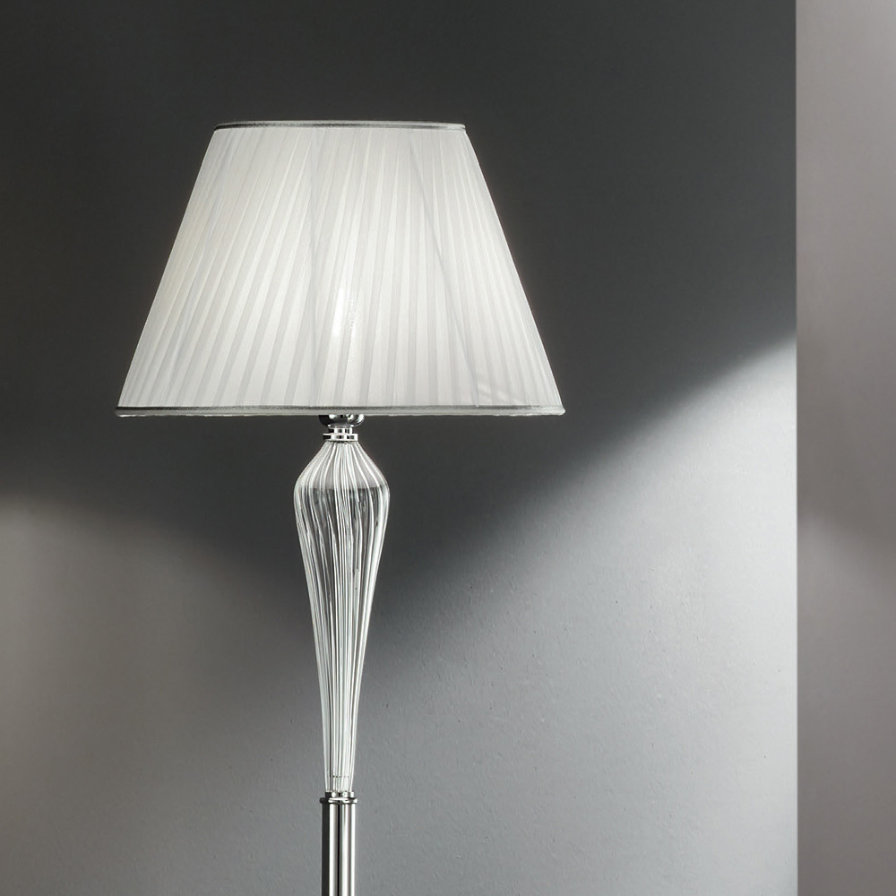 A característica peculiar é dada pelos motivos preciosos produzidos em vidro artesanal na Itália com efeito "rigaton" que revela o núcleo de metal e que sustenta o abajur em tecido branco com efeito plissado .