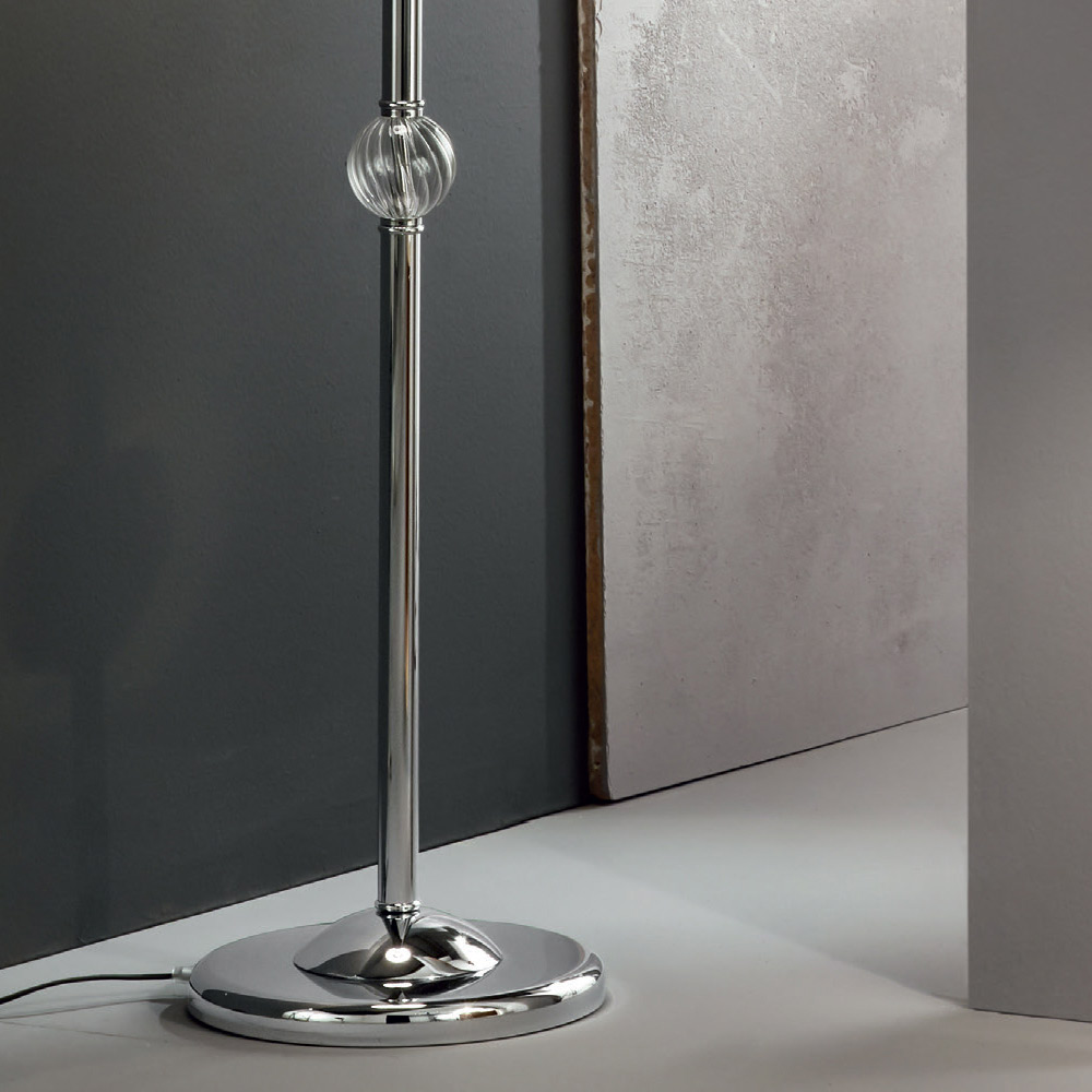 Este candeeiro de pé de estilo clássico é feito com uma base redonda e uma parte da estrutura em metal cromado.