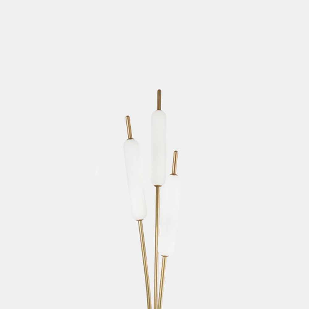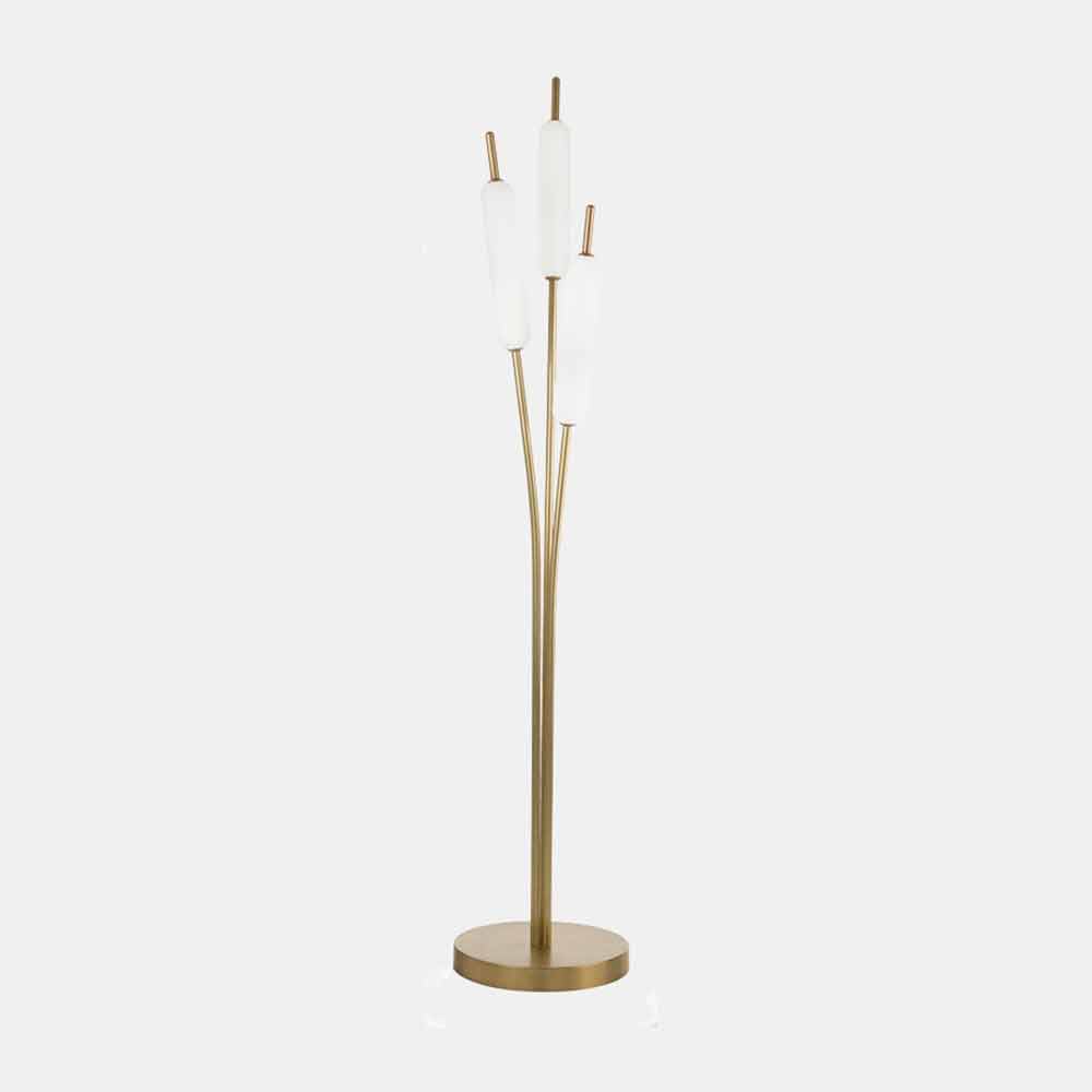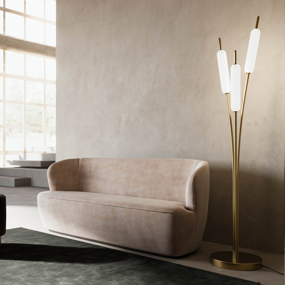 Candeeiro de pé com 3 luzes led para sala em vidro branco e latão natural, fabricado na Itália.