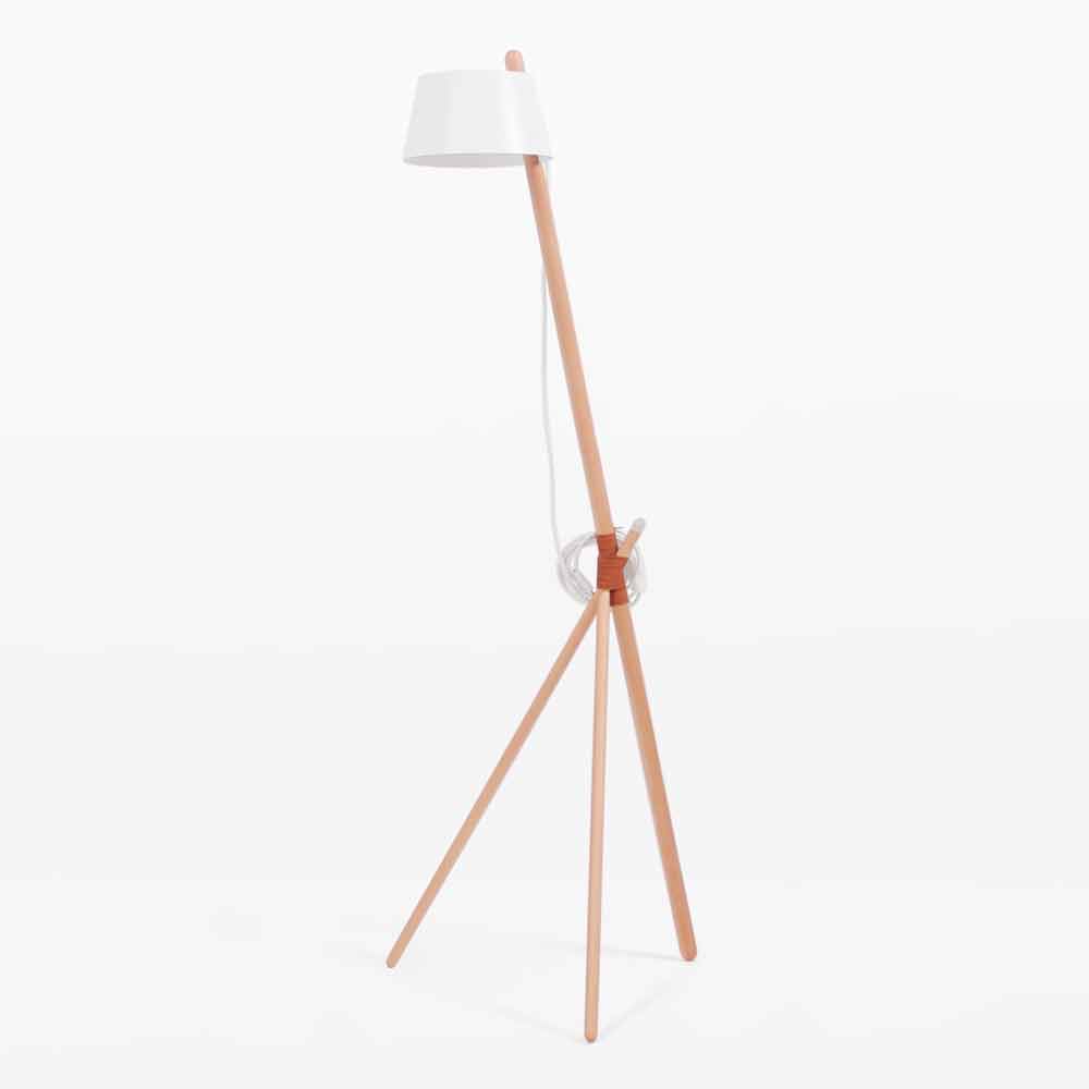 Candeeiro de chão de design moderno em madeira maciça com detalhes em pele vegan.