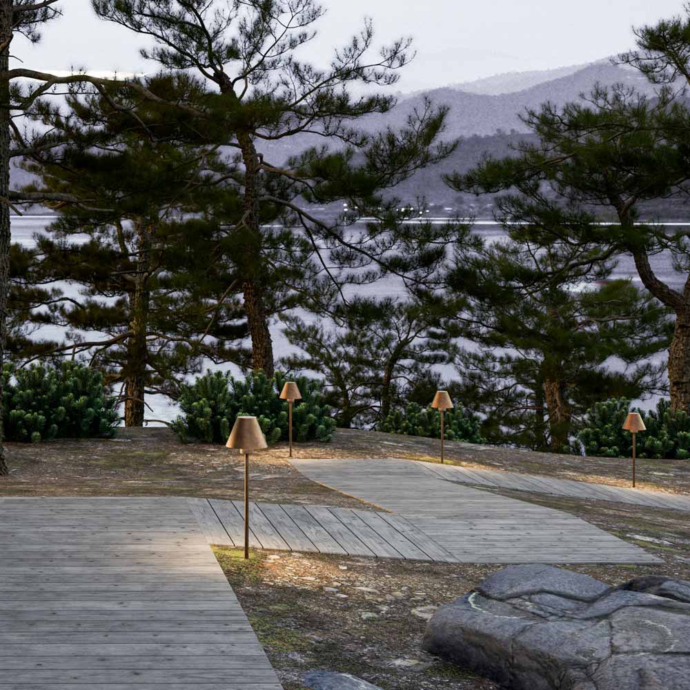 A colecção de candeeiros de exterior nasceu da vontade de trazer as características do design de interiores aos produtos destinados ao exterior, para criar ambientes acolhedores e familiares mesmo ao ar livre. Com linhas inspiradas na estética nórdica, os candeeiros de pé ou de parede são fabricados em latão e cobre.