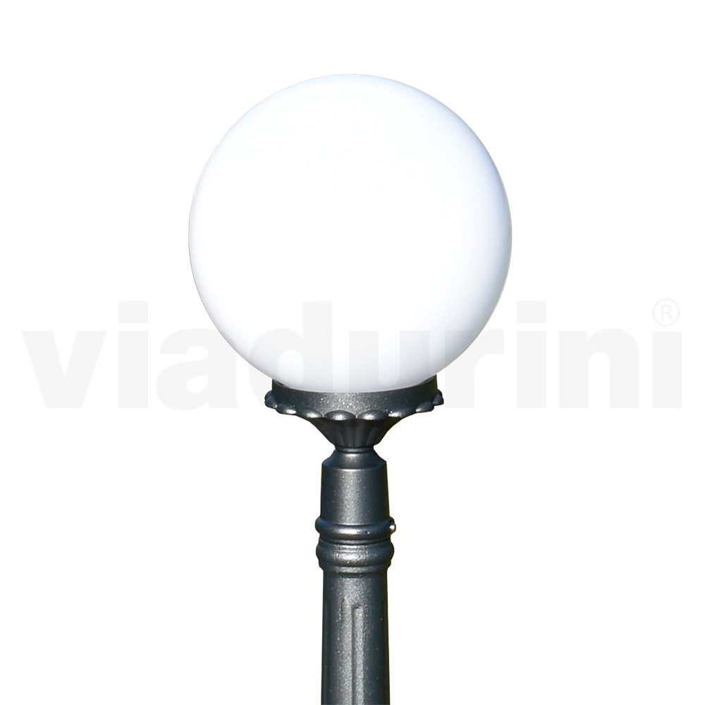 Candeeiro de jardim fabricado com estrutura em alumínio fundido com acabamento antracite e difusor esférico em acrílico opalino , inteiramente Fabricado em Itália.