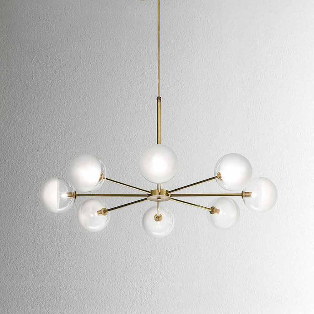 , feito de latão natural com esferas de vidro transparente e fosco.