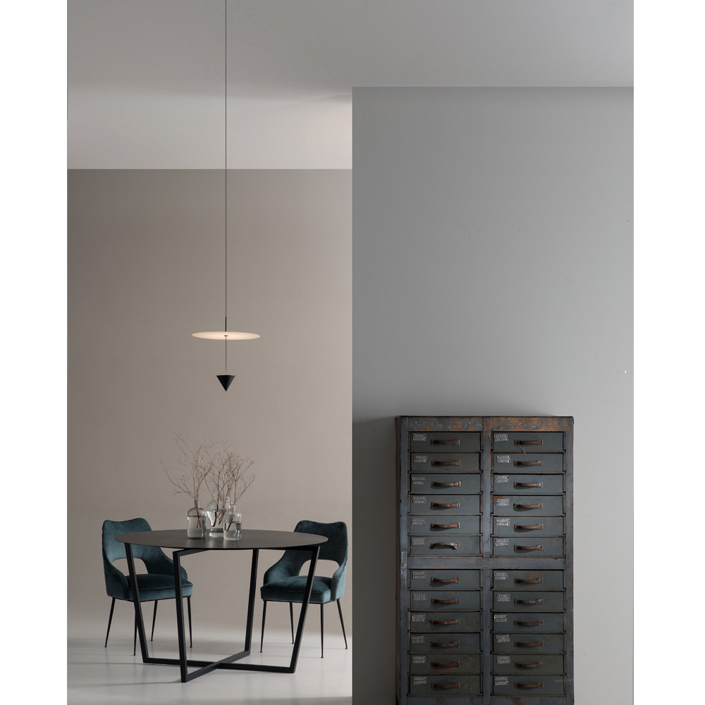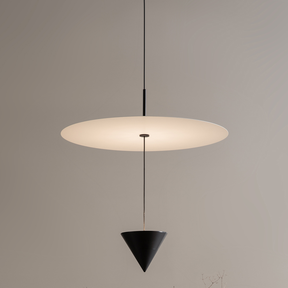 É constituído por um elemento decorativo circular em alumínio branco e um cone preto .