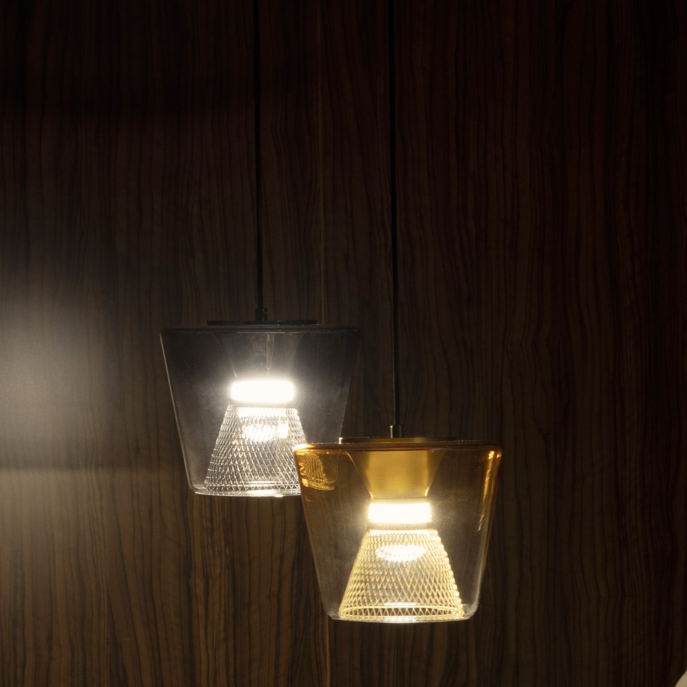 vidro . A união do vidro liso e trabalhado torna-o numa peça única que cria um jogo de luz que irá captar o olhar e encantar os sentidos. Os acabamentos disponíveis acrescentam um toque de classe e requinte, tornando este candeeiro perfeito para adicionar um ponto de luz elegante tanto em ambientes modernos como clássicos. Ideal para realçar o centro de uma sala de estar ou elevar-se graciosamente sobre uma mesa de jantar, este