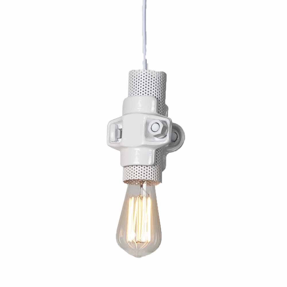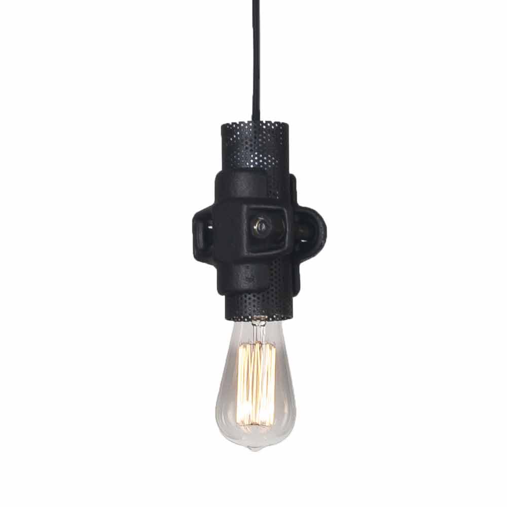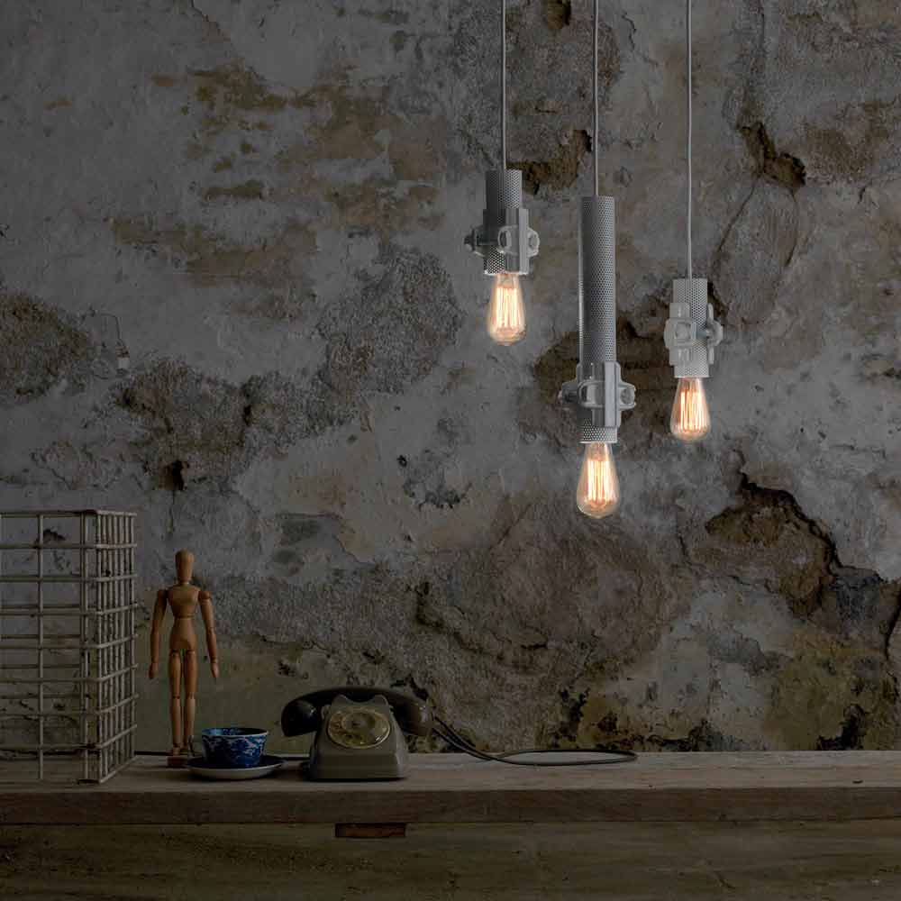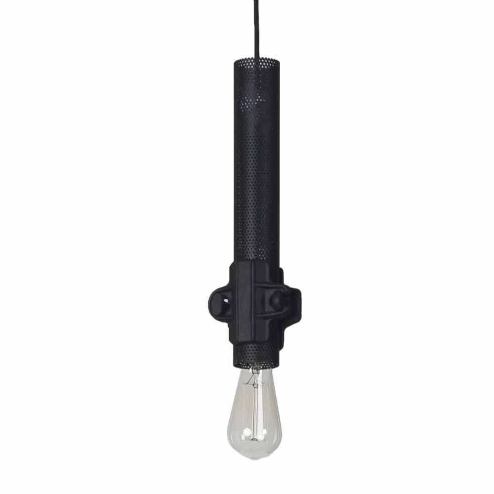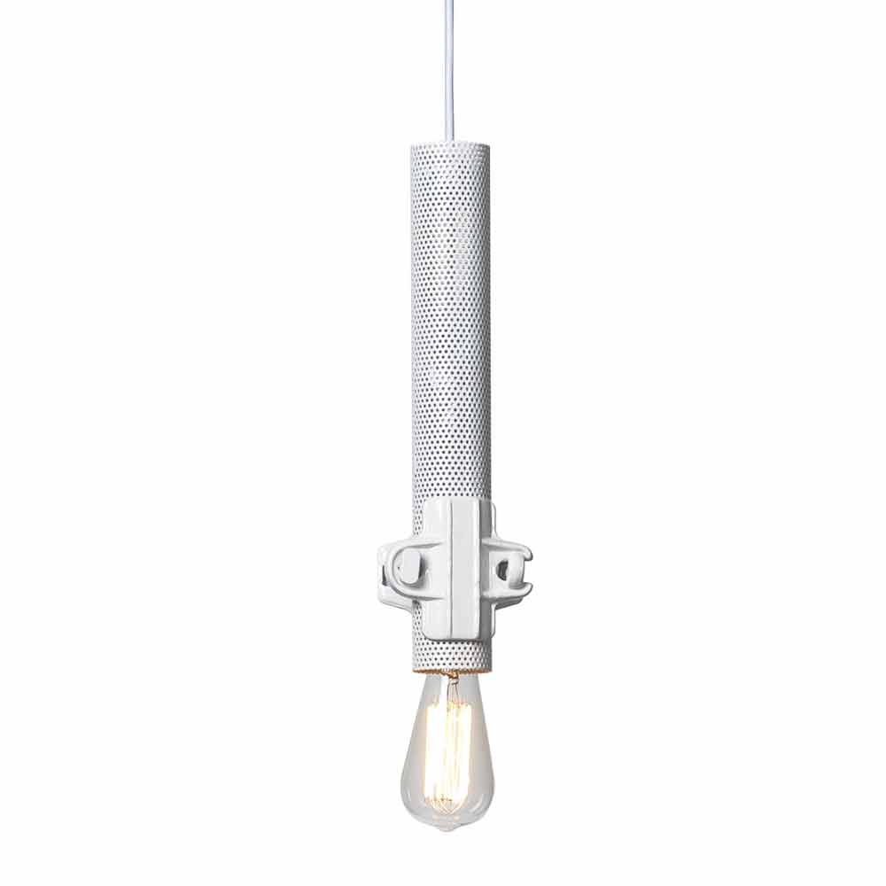 Esta original e singular lâmpada suspensa é composta por um tubo e uma junta, dois elementos que podem se transformar em vetores de luz para um design entre o técnico e o sofisticado, de estilo industrial.