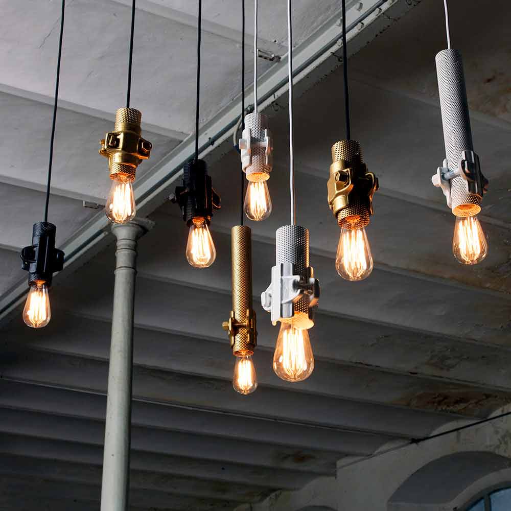 A lâmpada é feita de metal em três acabamentos, um material que muitas vezes representa o estrutural e mais frequentemente a membrana: uma folha muito fina para ser dobrada, curvada e perfurada.