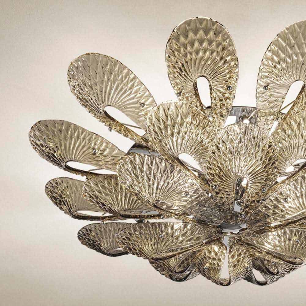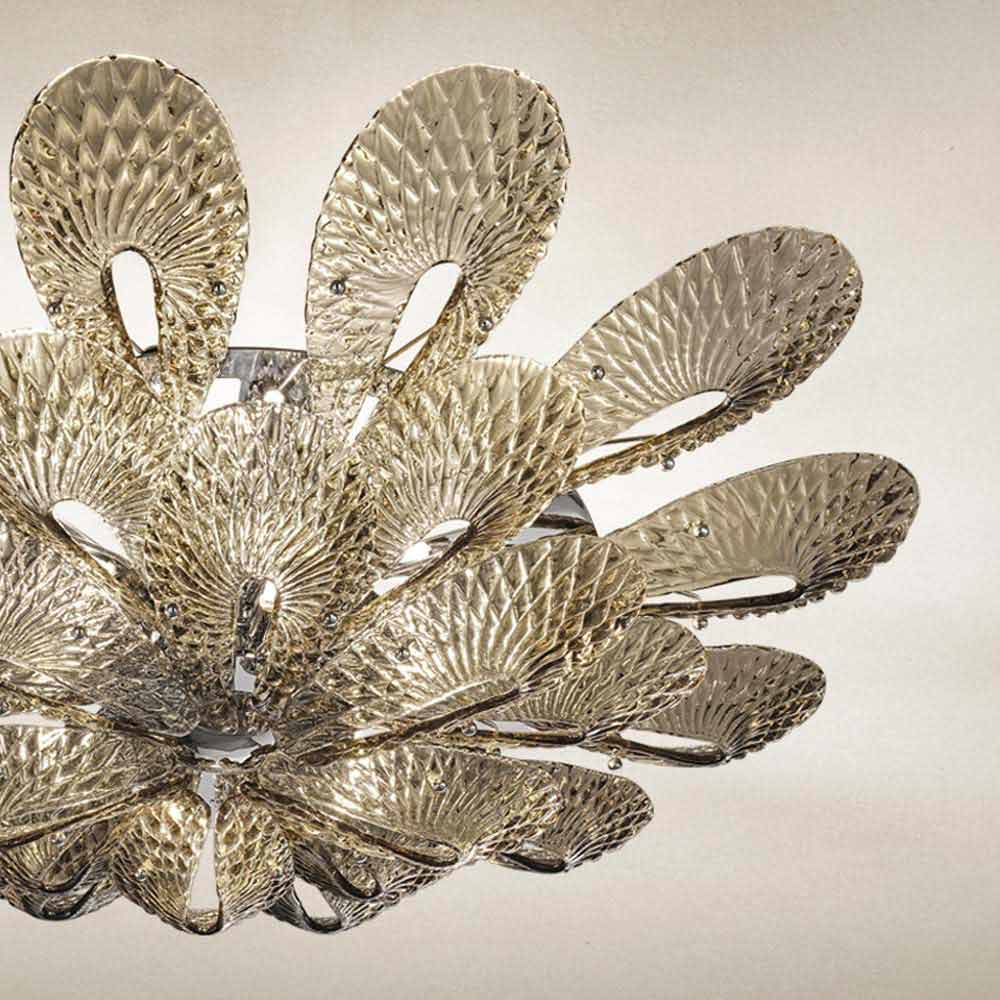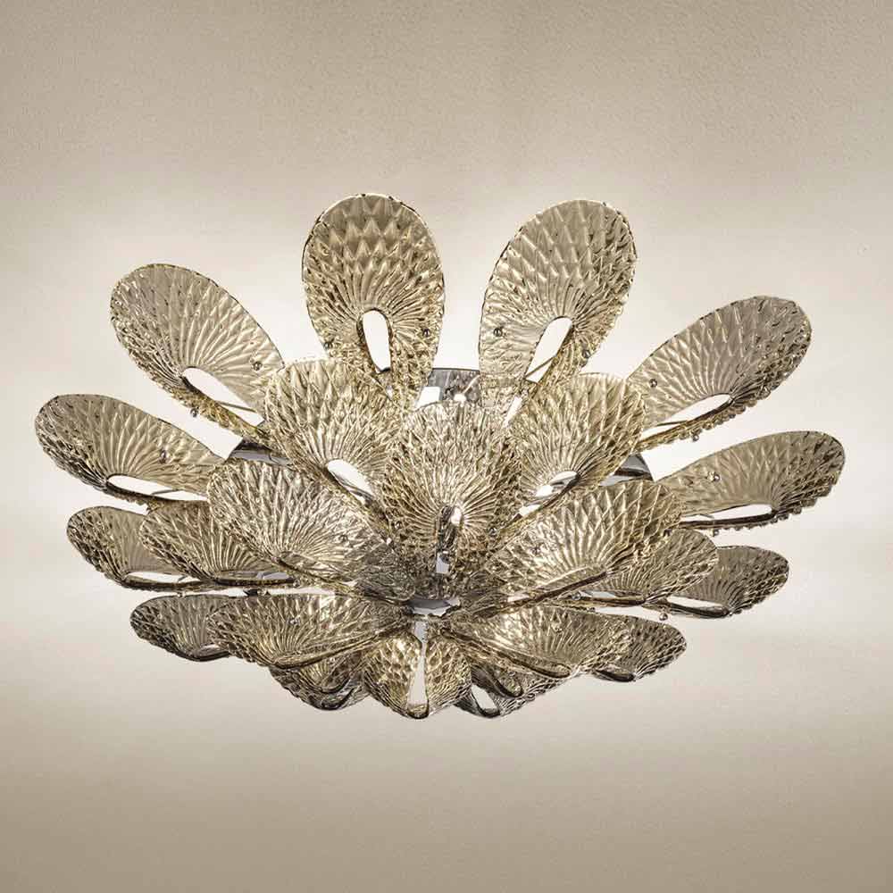 Majestoso e elegante candeeiro de tecto made in Italy in Venice em vidro colorido trabalhado à mão com acabamento esfumaçado e detalhes em metal cromado polido . Um desenho delineado por formas inéditas que se cristalizam para dar vida a delicadas fitas de vidro que, unidas, convergem em um fulcro luminoso. A sua estética destaca-se pelo requinte de estilo que se adapta perfeitamente a ambientes com mobiliário contemporâneo e confere carácter a espaços com um gosto mais clássico, revelando-se eclécticos e versáteis . Para enriquecer seu valor é o padrão de diamante particular que cobre toda a superfície, criando jogos de luz exclusivos .