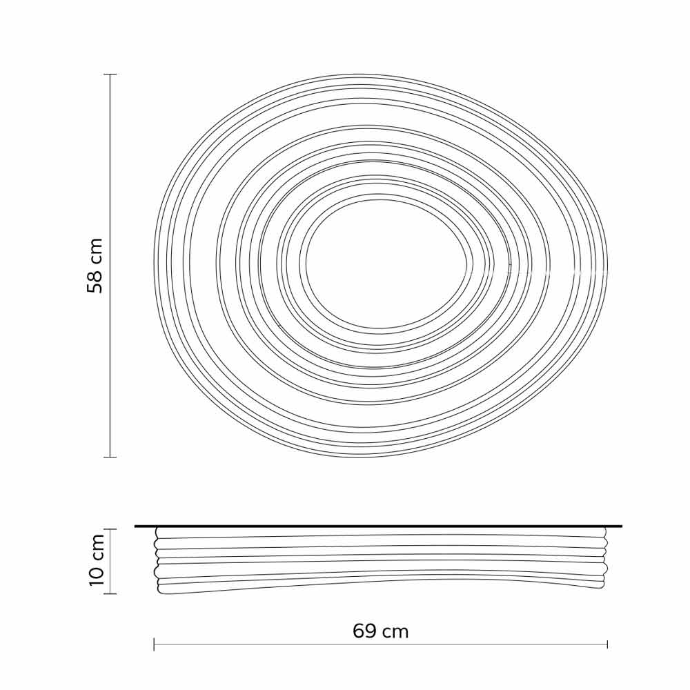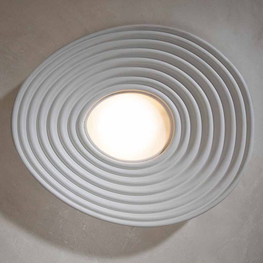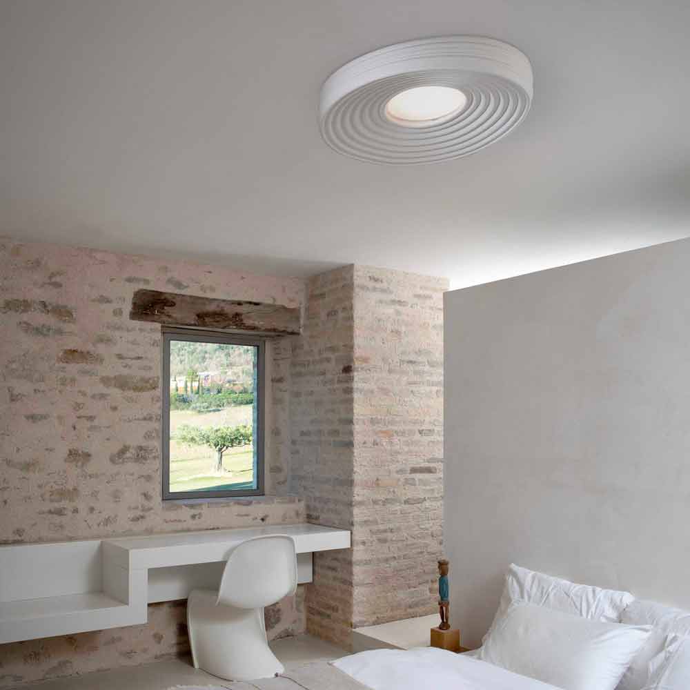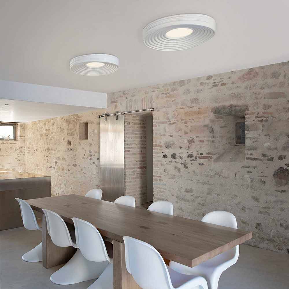 Este original e singular candeeiro de tecto cria belos jogos de luz graças à parte central que garante uma iluminação directa e que se propaga na superfície do candeeiro, reflectindo-se em círculos concêntricos.