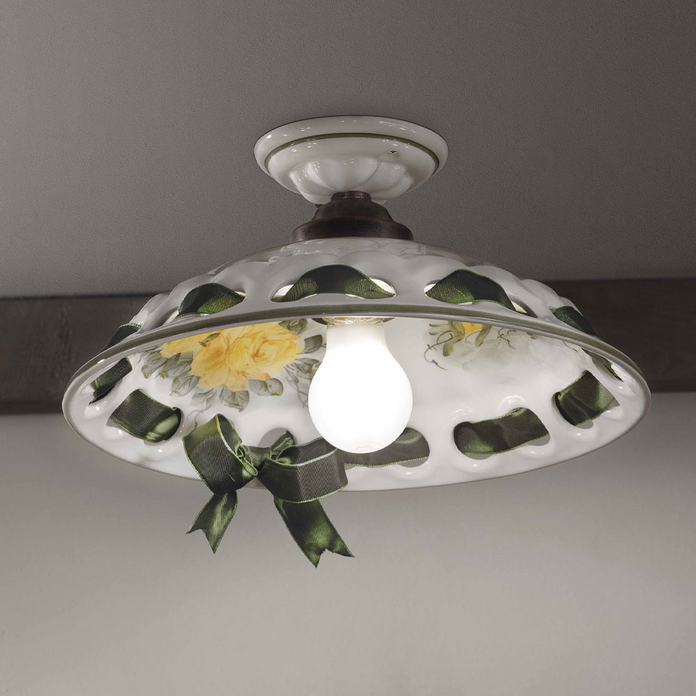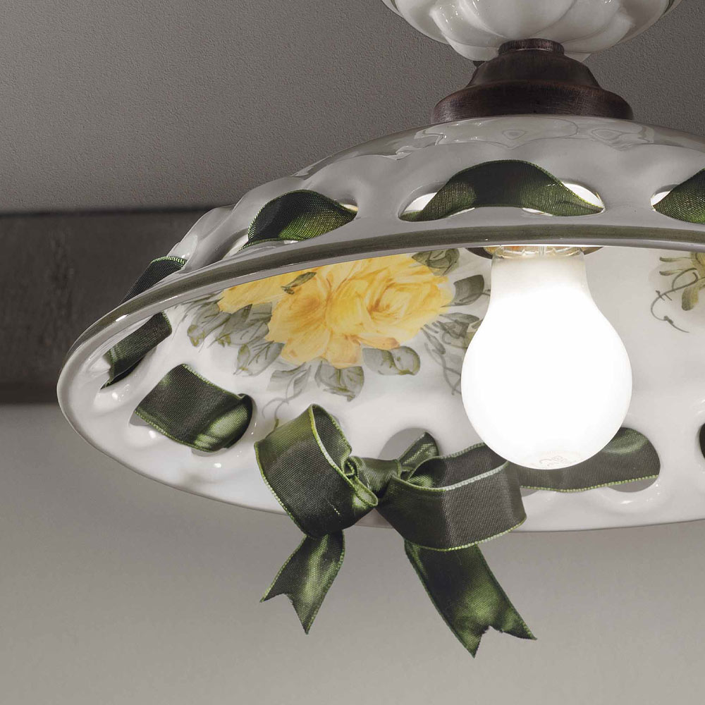 Candeeiro de teto em metal e cerâmica artesanal com fitas, fabricado na Itália pela Ferroluce.