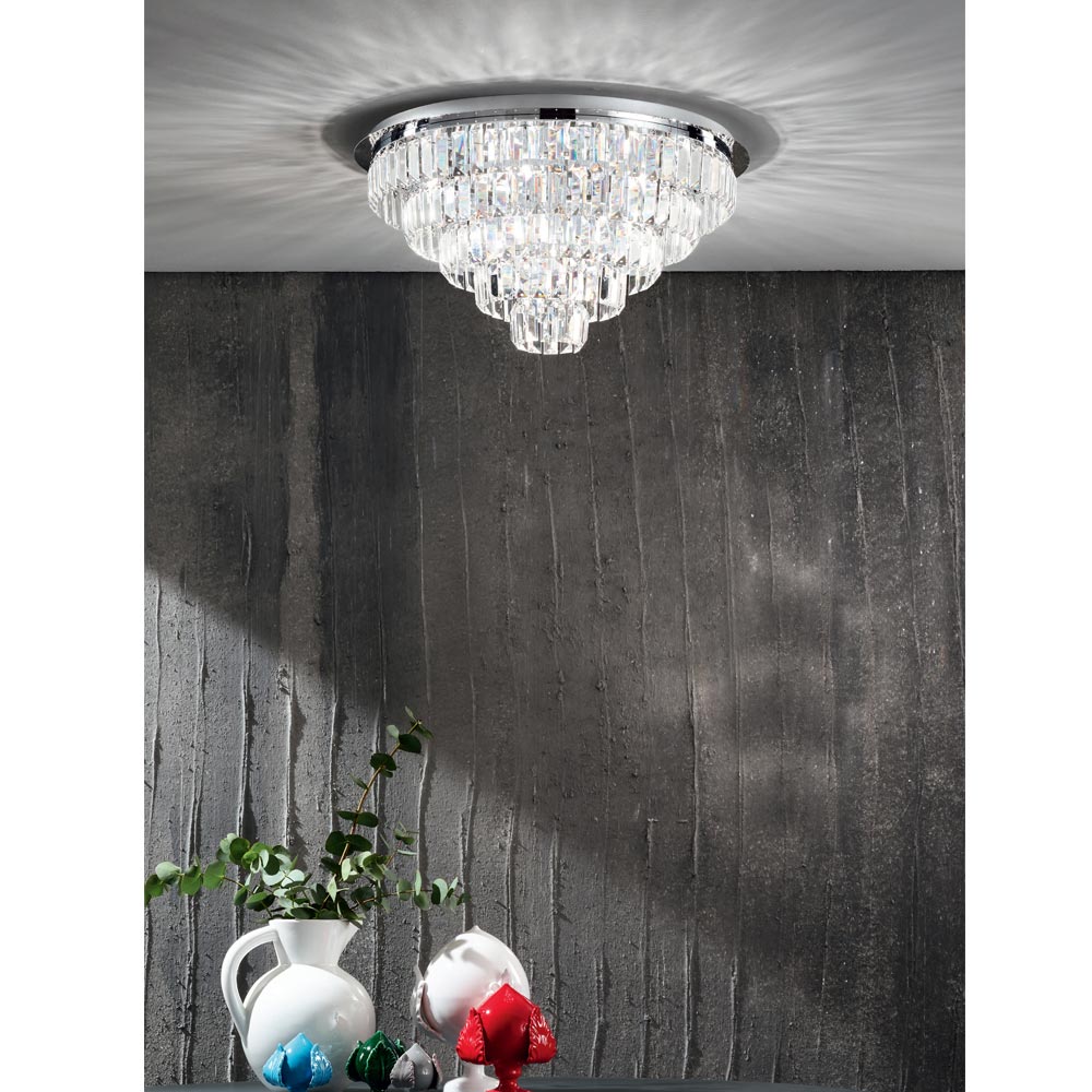 Esta luz de teto da sala de estar com 9, 12 ou 16 luzes é capaz de criar atmosferas luxuosas e importantes graças ao seu design precioso e brilhante.