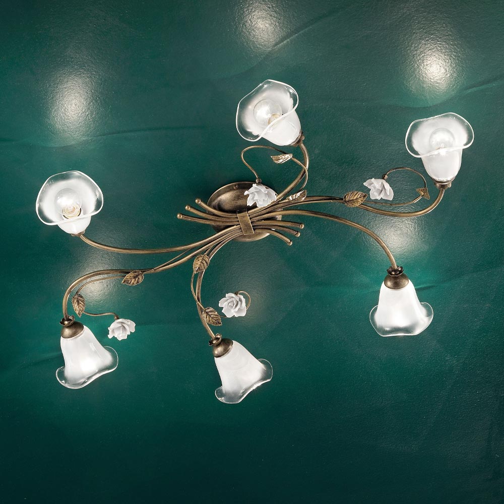 Este candeeiro de teto de 6 luzes é inteiramente feito com uma estrutura metálica que lembra ramos frondosos e abajures sombreados em vidro jateado com decorações artesanais em forma de rosas de cerâmica , para destacar o artesanato e as habilidades manuais dos artesãos.
