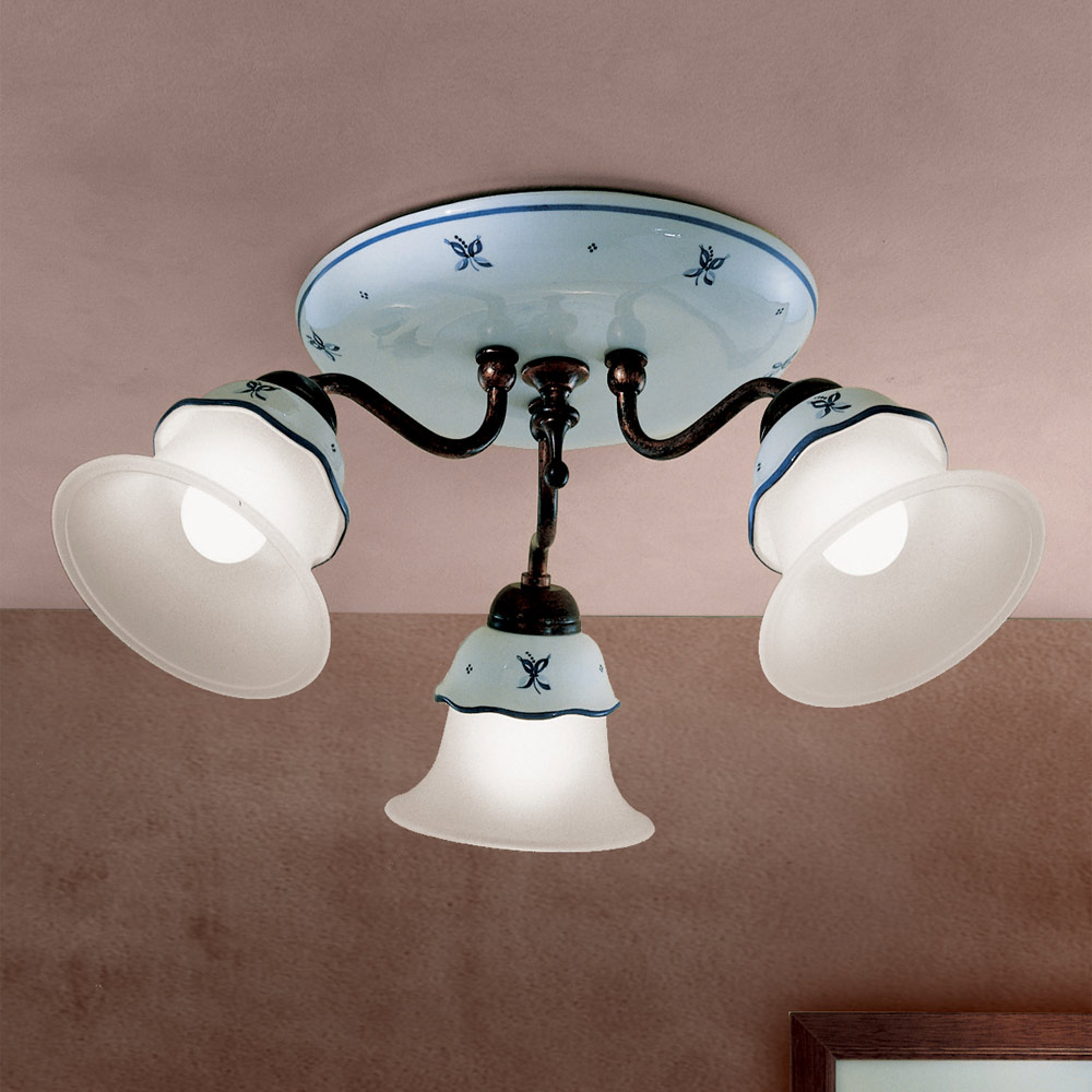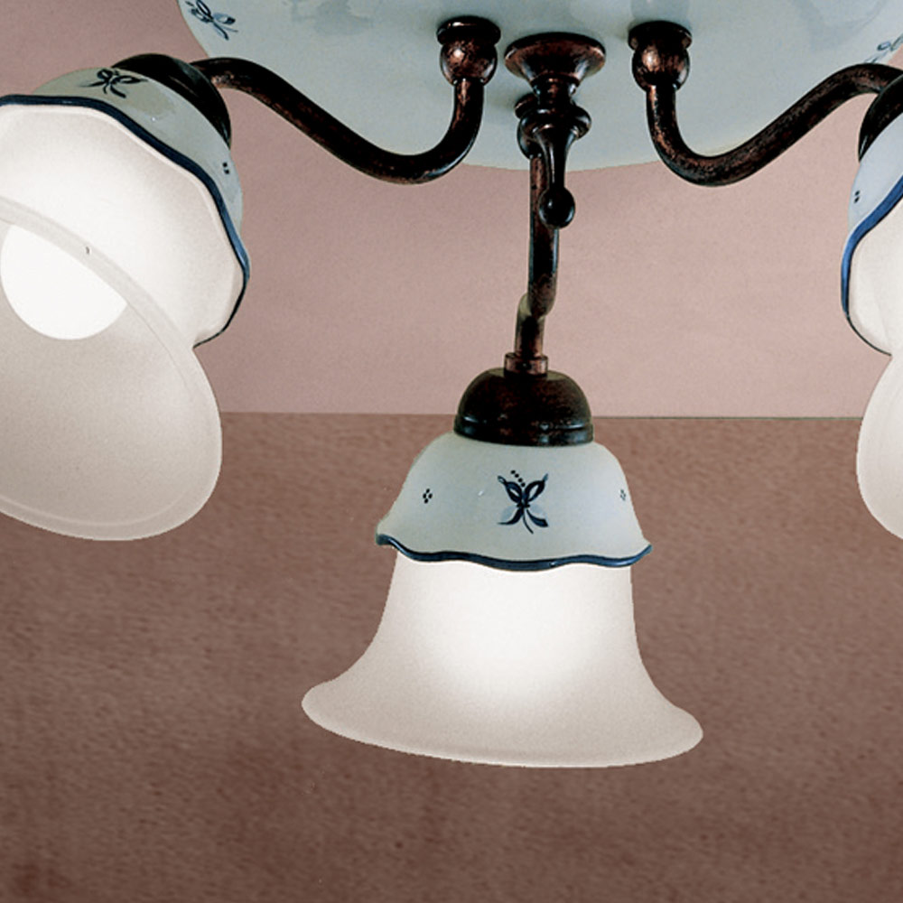 Lâmpada de teto em ferro, cerâmica decorada à mão e vidro gravado com ácido fabricado na Itália pela Ferroluce.