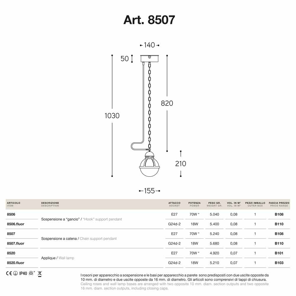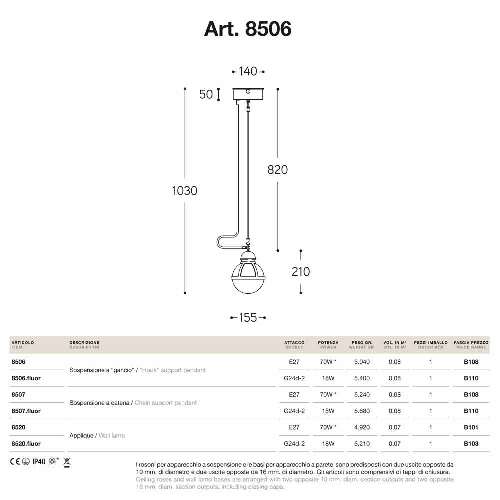 Cimosa está disponível com gancho ou suporte de corrente e com diferentes soquetes: