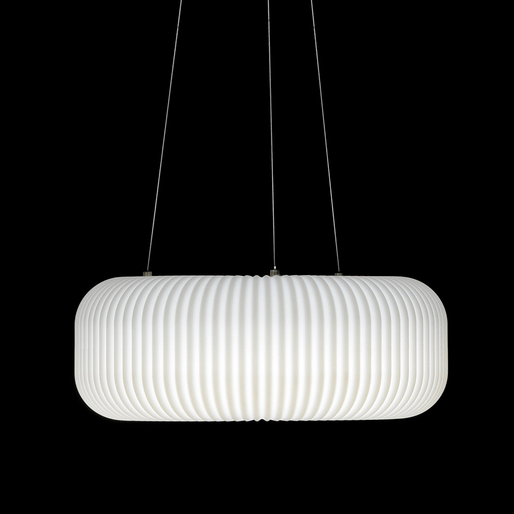 Este candeeiro destaca-se pelo seu design elegante e minimalista , que combina finos cabos metálicos com um difusor de plástico de formato orgânico. O plástico, trabalhado com detalhes plissados, confere um toque de requinte visual e ajuda a difundir a luz de maneira suave e uniforme, criando um ambiente acolhedor e relaxante.