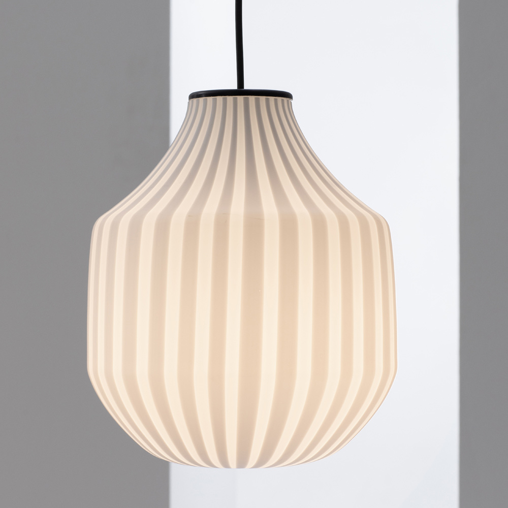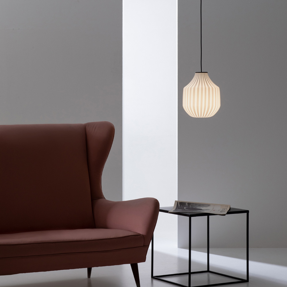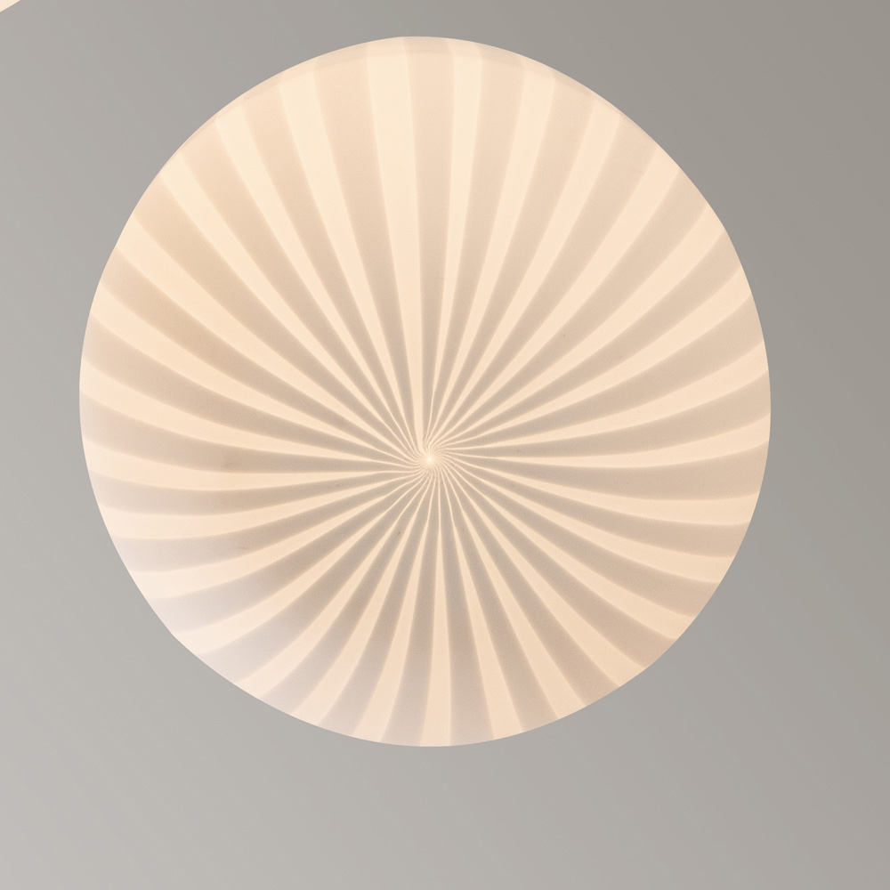 O candeeiro é feito com um difusor de vidro filigranado branco de construção artesanal , material que confere brilho e modernidade à luz, que por ela passa criando ambientes sublimes e envolventes, e uma base de alumínio amovível.