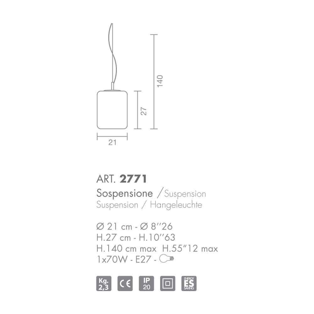 Candeeiro suspenso Selene Domino, feito em vidro soprado Ø21 H 27/140 cm.