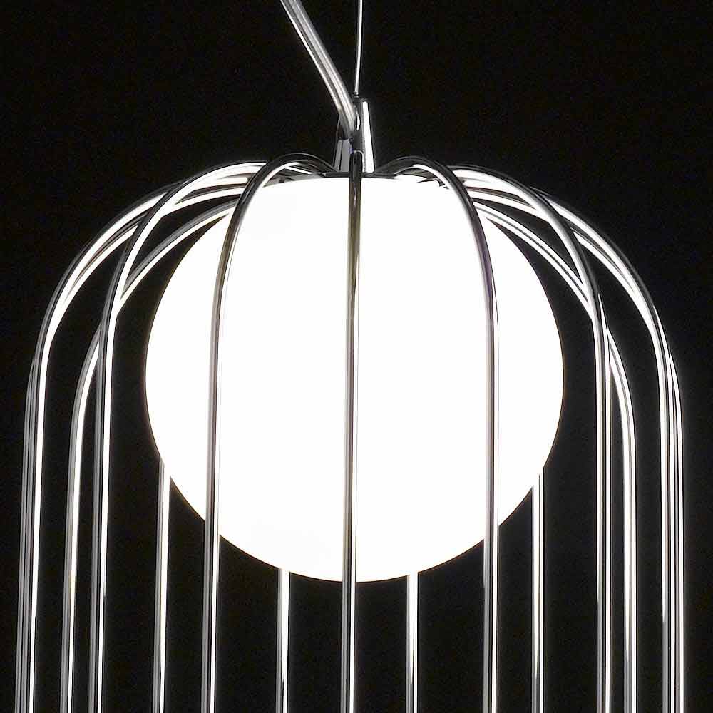 Recolha de três suspensões e três candeeiros de mesa, que podem atingir um tamanho considerável, compostos por uma gaiola de metal e uma bola de vidro branco leitoso soprado.
