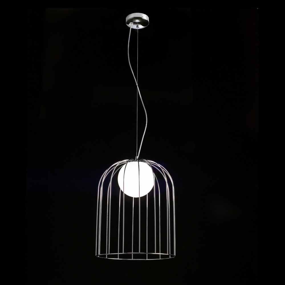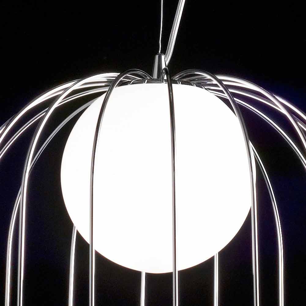 Recolha de três suspensões e três candeeiros de mesa, que podem atingir um tamanho considerável, compostos por uma gaiola de metal e uma bola de vidro branco leitoso soprado.