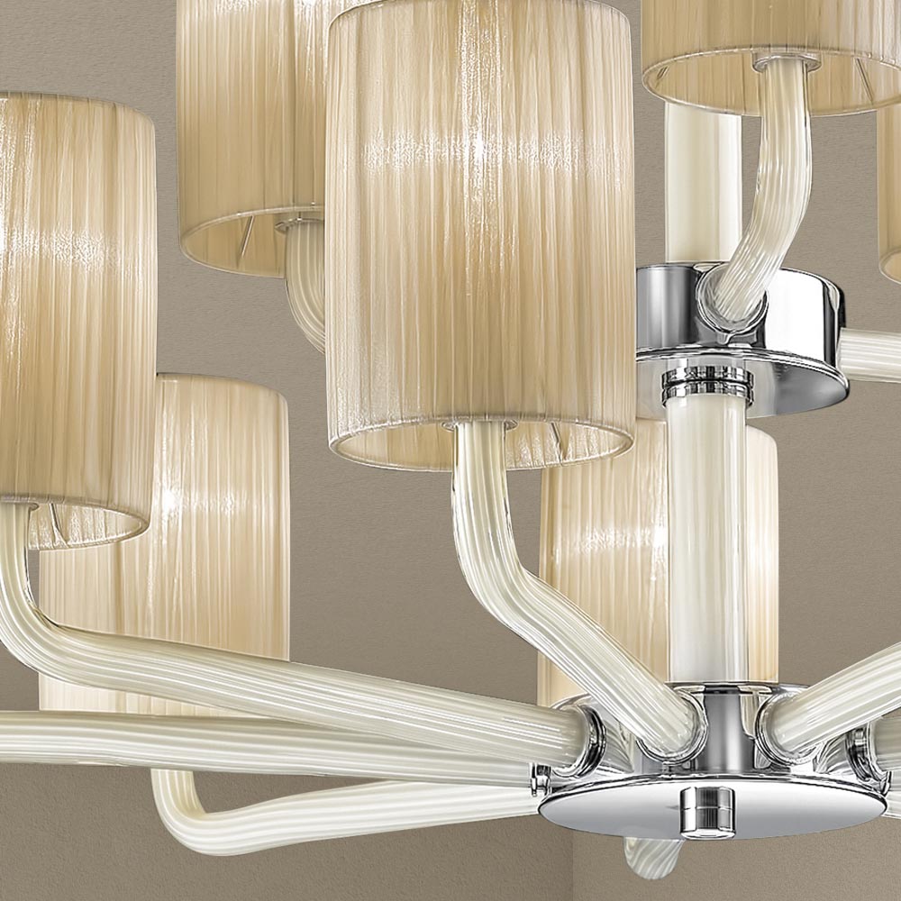 Lustre de 12 luzes feito à mão em vidro veneziano com abajures de tecido.