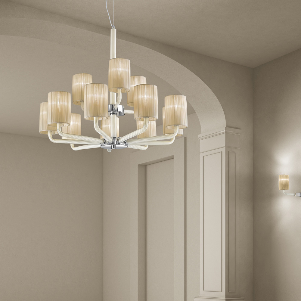 Candelabro de 12 luzes feito à mão na Itália em vidro Veneza com acabamento em branco leitoso-marfim com detalhes em metal em acabamento cromado polido e elegantes abajures em tecido . Uma peça de mobiliário caracterizada por um design articulado, mas essencial , capaz de enriquecer o ambiente dando caráter graças à sua forte presença de palco típica dos lustres clássicos do passado. Os braços tubulares de vidro suportam de forma delicada e elegante os maravilhosos abajures de tecido que ajudam a transportar a luz em todas as direções para uma iluminação quente , suave e envolvente .