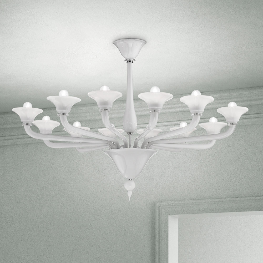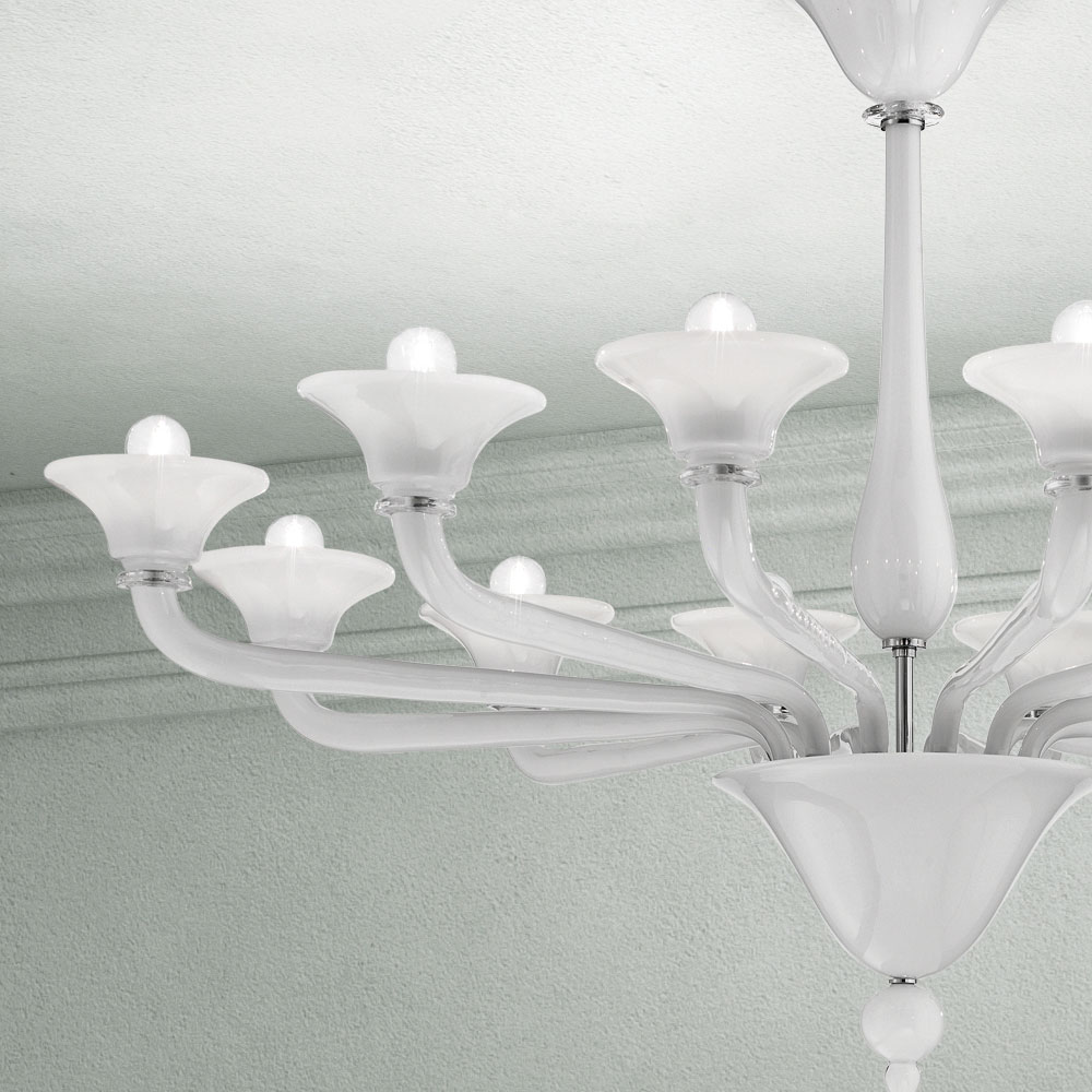 Candelabro de 12 luzes feito de vidro Veneza com acabamento em cristal branco leite com detalhes em metal com acabamento cromado brilhante . Um encontro inédito entre linhas históricas e design contemporâneo para dar vida a um móvel com charme e elegância atemporais. A sua estética caracteriza-se por um volume articulado que se torna dinâmico e leve através da vibração luminosa das maravilhosas superfícies de vidro soprado que alternam os elegantes braços transparentes com as taças confeccionadas com a técnica do casing . A sublinhar o seu valor é a atenção ao detalhe que transparece nos componentes metálicos cromados que permitem que o produto se adapte a diferentes gostos e situações de utilização.