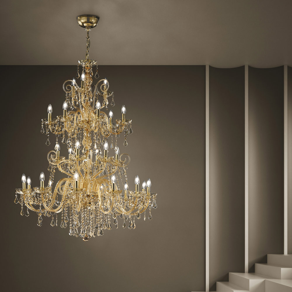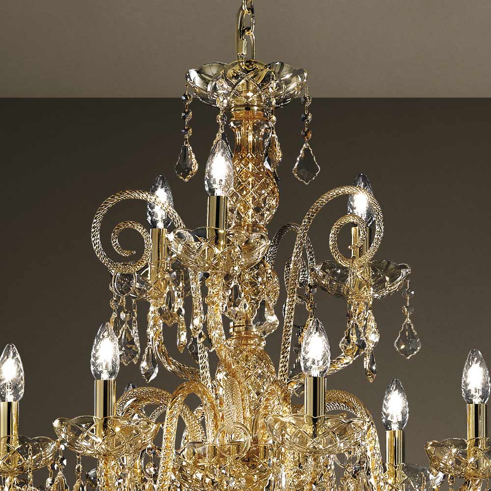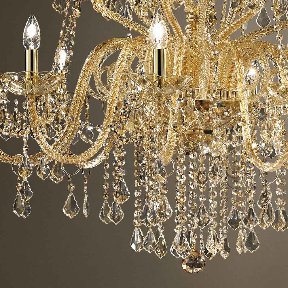 Candelabro com 27 luzes feito de vidro Veneza com acabamento decoração âmbar com pingentes nacionais e detalhes em metal dourado brilhante . Feito artesanalmente , este complemento é caracterizado pelos maravilhosos braços trabalhados à mão através da técnica de torção que cria um resultado exclusivo que lembra esteticamente o entrelaçamento de uma corda, dando personalidade ao lustre. Uma verdadeira chuva de luz invade a estrutura do candelabro e depois se espalha pelo ambiente circundante por meio de refração através da magia de lantejoulas e pendentes de cristal com finos acabamentos, criando assim um efeito cenográfico evocativo e onírico capaz de encantar e surpreender. por sua elegância e majestade .