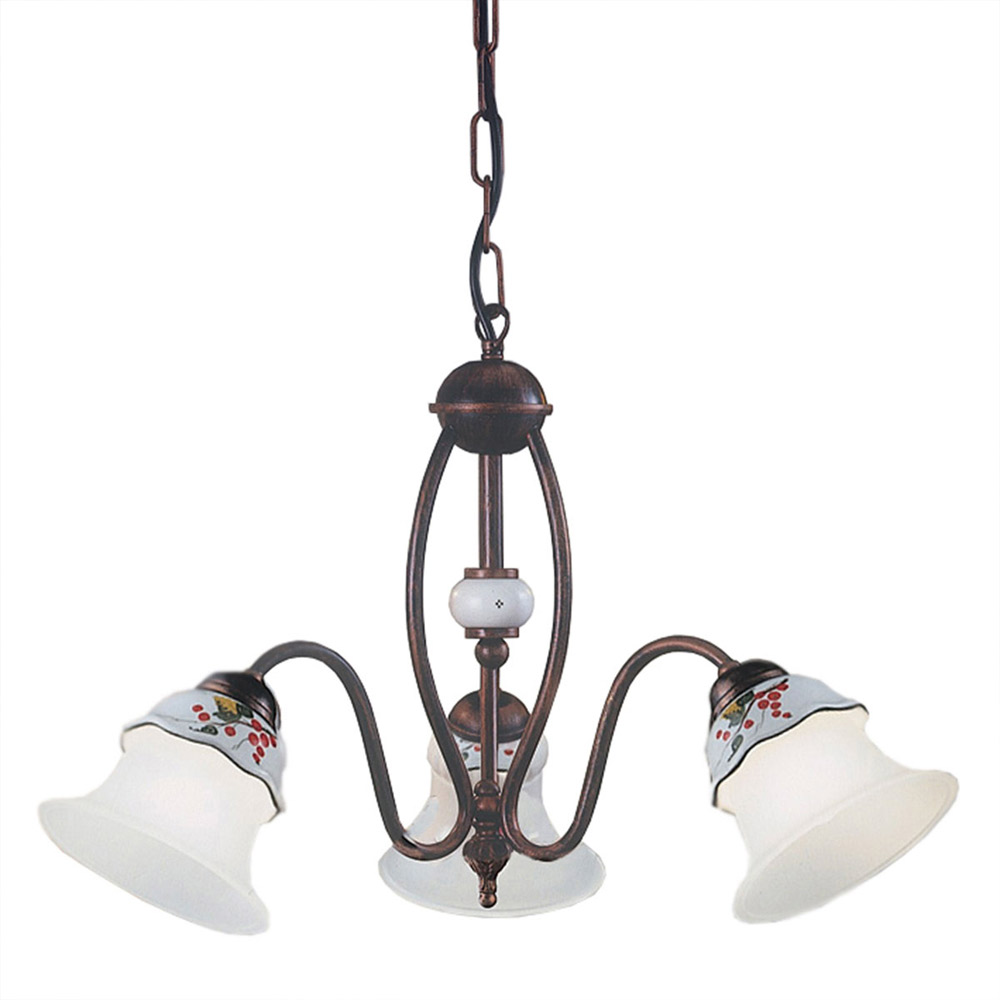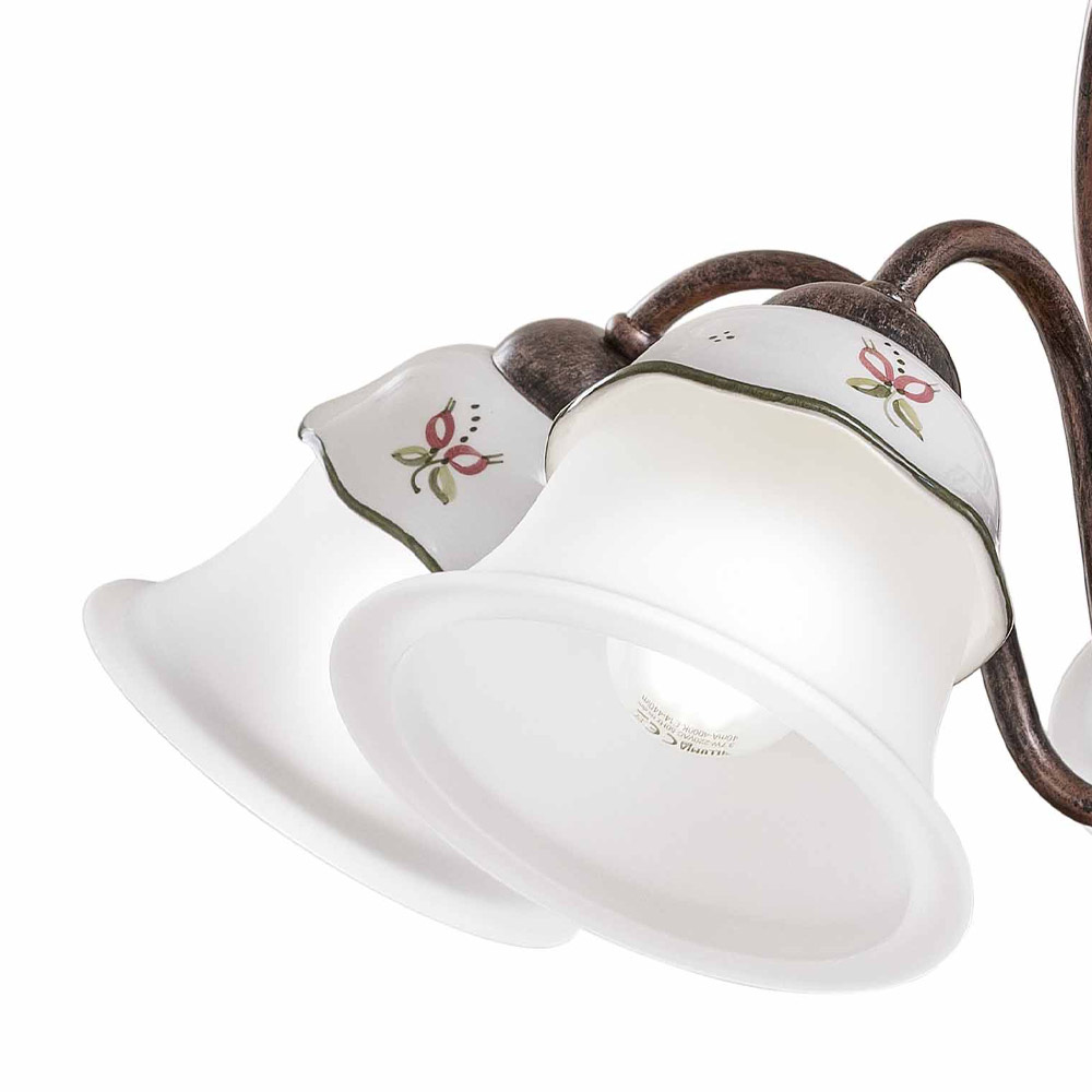 Candelabro com 3 ou 5 luzes em ferro, cerâmica decorada à mão e vidro gravado com ácido fabricado na Itália pela Ferroluce.