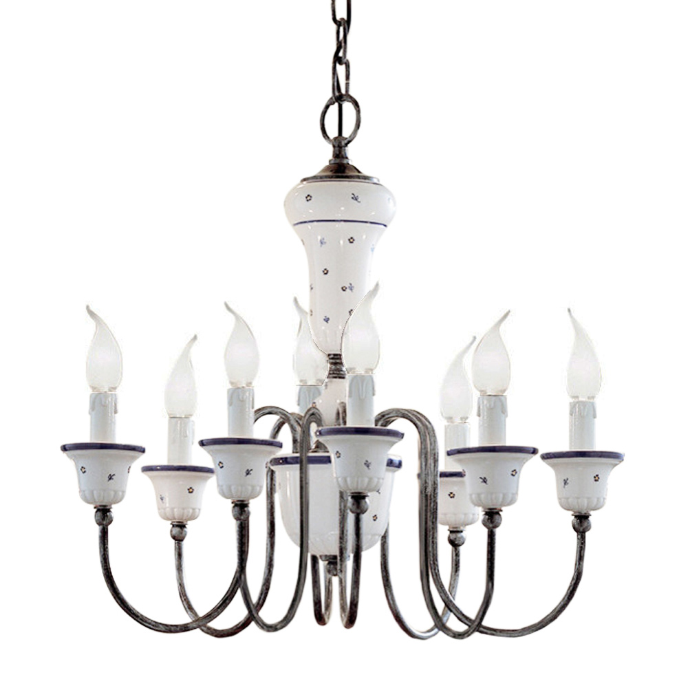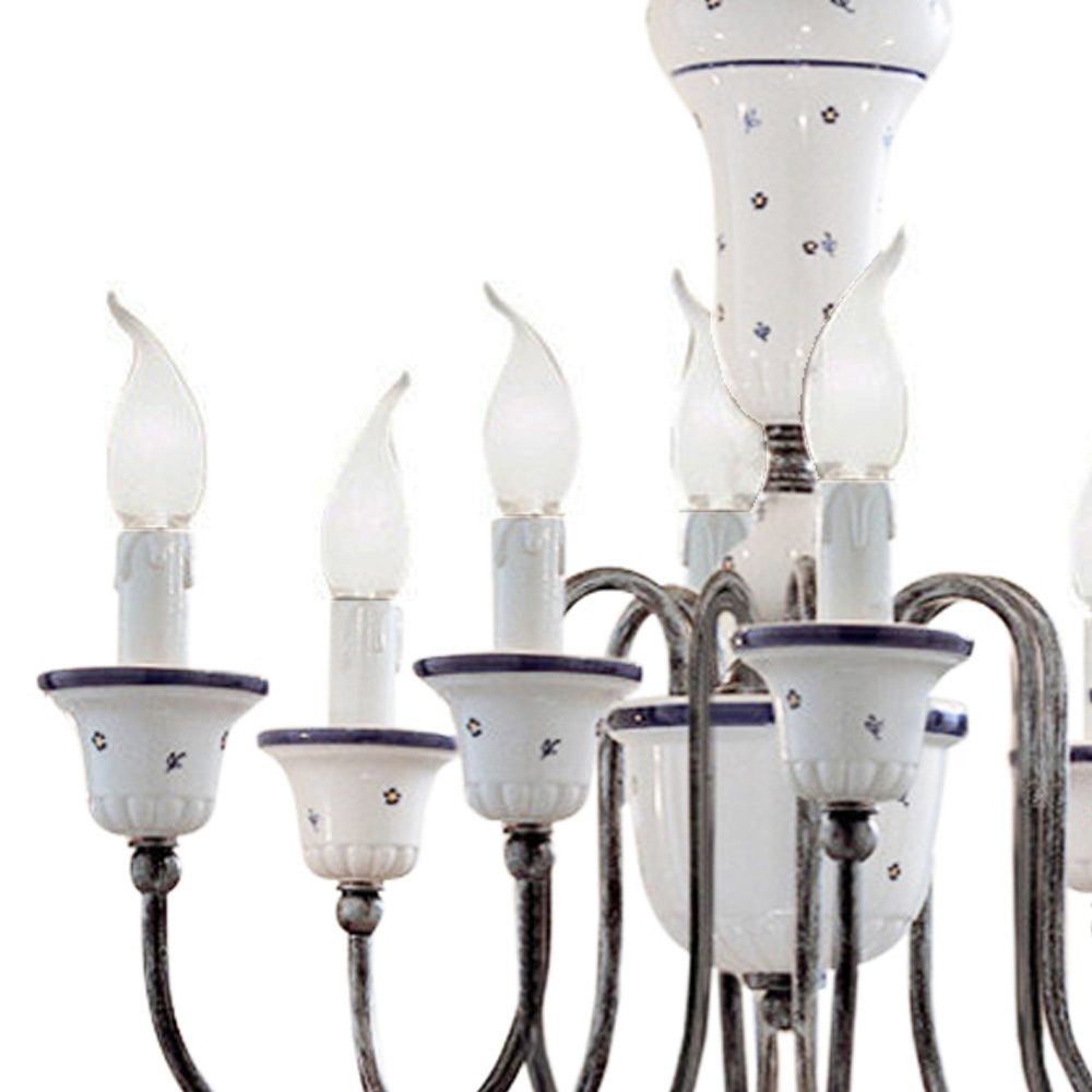 Latão de 8 lâmpadas artesanal e lustre de cerâmica pintado à mão feito na Itália pela Ferroluce.