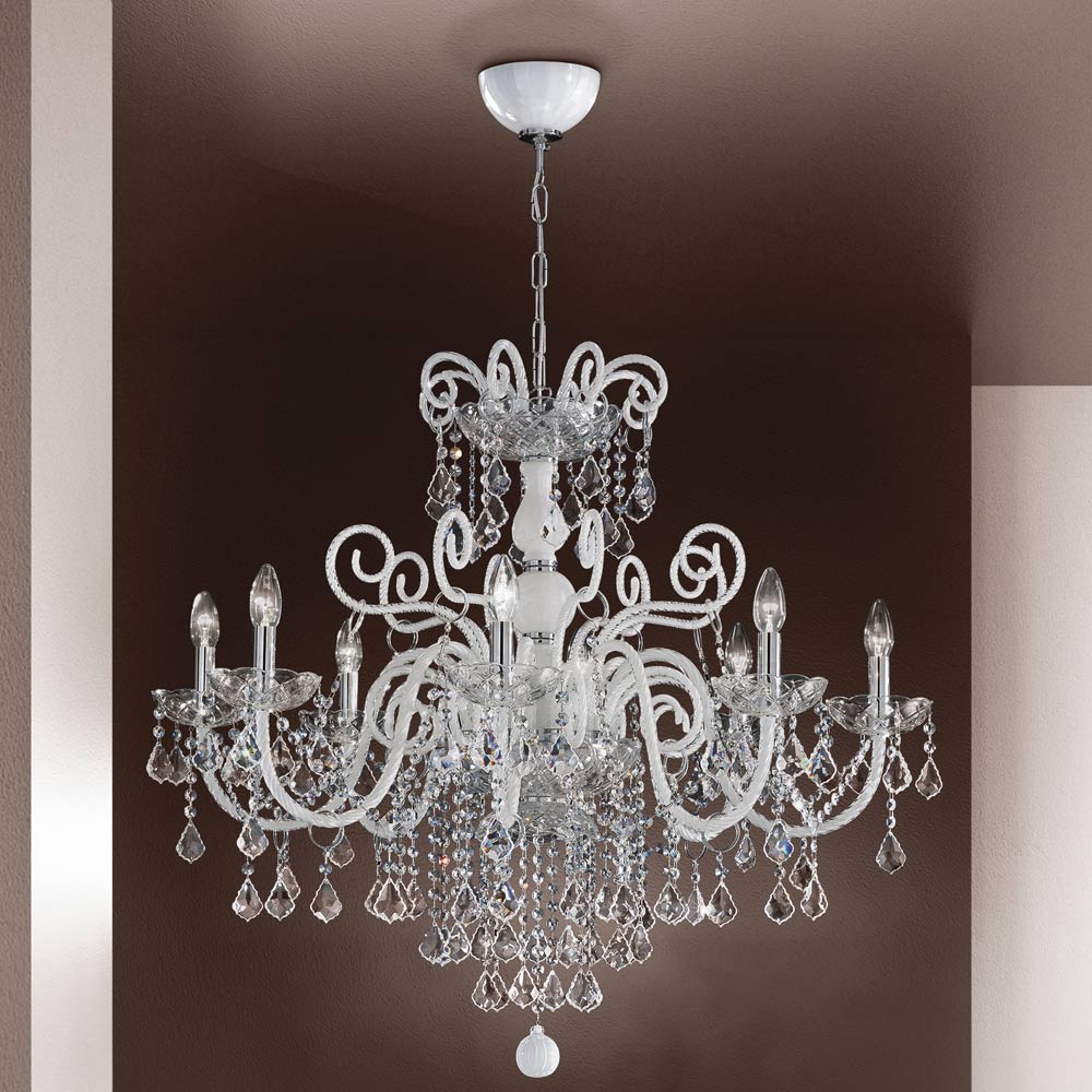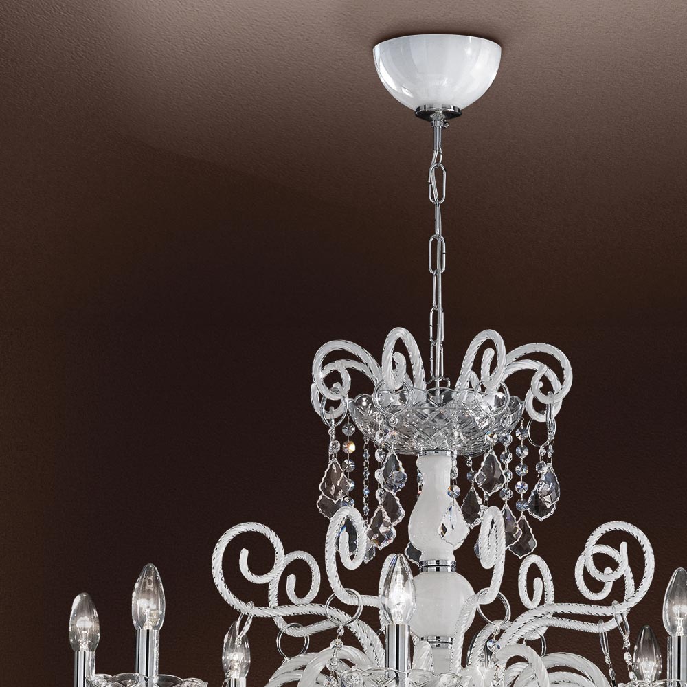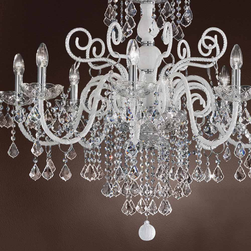 Candelabro de 8 luzes feito de vidro veneziano com acabamento branco leite com pingentes de chumbo e metal cromado polido . Feito artesanalmente , este complemento é caracterizado pelos maravilhosos braços trabalhados à mão através da técnica de torção que cria um resultado exclusivo que lembra esteticamente o entrelaçamento de uma corda, dando personalidade ao lustre. Uma verdadeira chuva de luz invade a estrutura do candelabro e depois se espalha pelo ambiente circundante por meio de refração através da magia de lantejoulas e pendentes de cristal com finos acabamentos, criando assim um efeito cenográfico evocativo e onírico capaz de encantar e surpreender. por sua elegância e majestade .